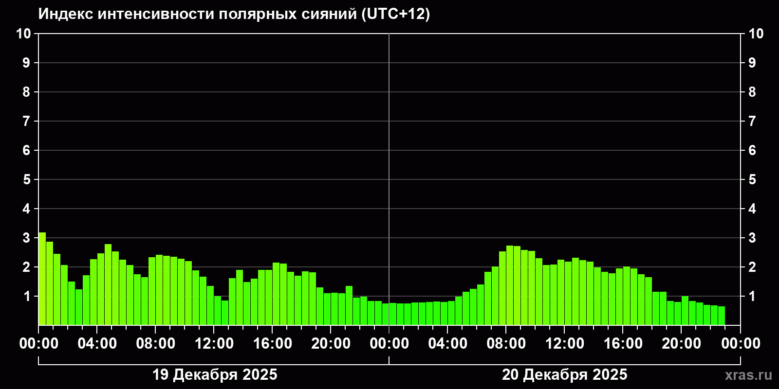 Изменения индекса интенсивности полярных сияний с 2025-12-19 по 2025-12-20 по местному времени