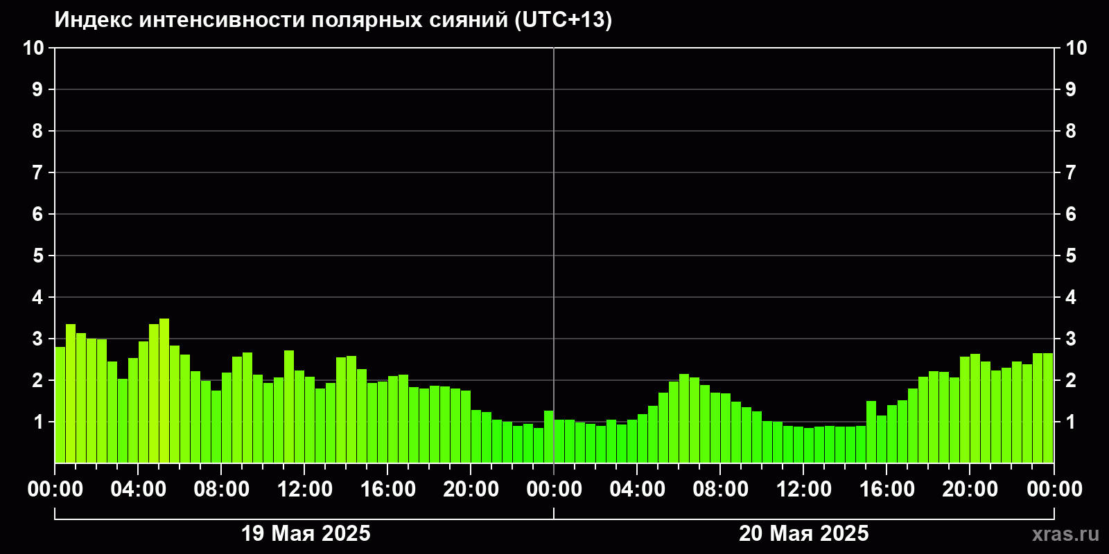 Изменения индекса интенсивности полярных сияний с 2025-05-19 по 2025-05-20 по местному времени