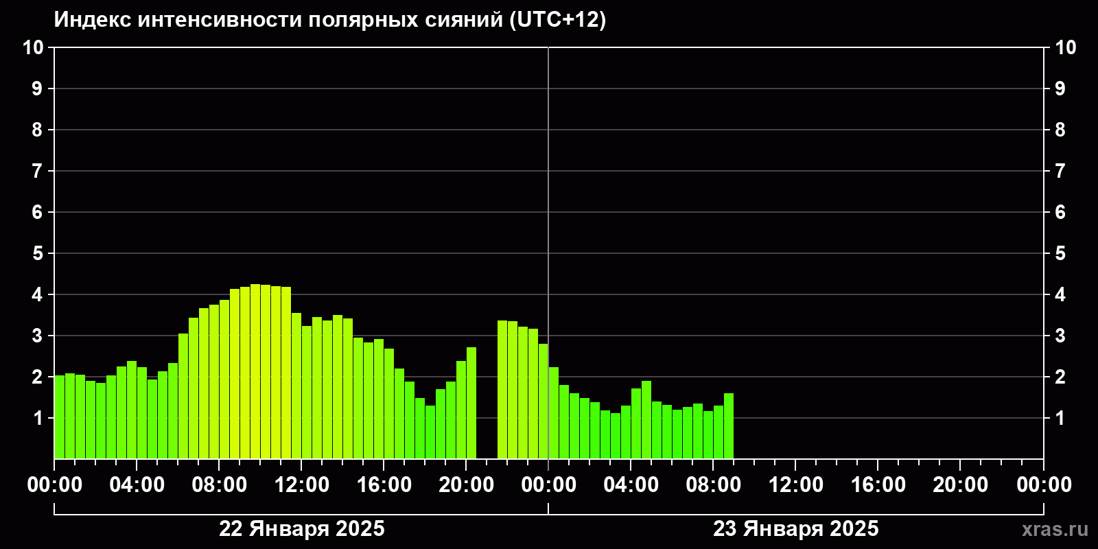 Изменения индекса интенсивности полярных сияний с 2025-01-22 по 2025-01-23 по местному времени