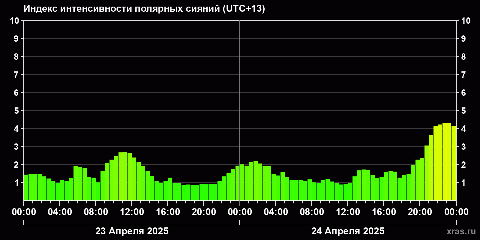 Изменения индекса интенсивности полярных сияний с 2025-04-23 по 2025-04-24 по местному времени