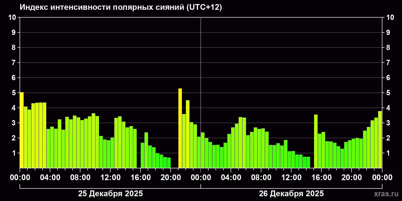 Изменения индекса интенсивности полярных сияний с 2025-12-25 по 2025-12-26 по местному времени
