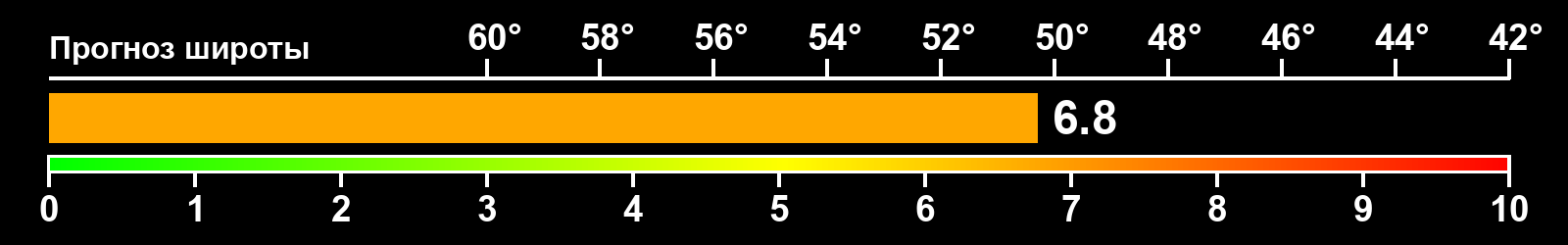Индекс интенсивности полярных сияний и теоретически возможная широта наблюдений для ночного времени в западном полушарии по состоянию на 2025-02-27 23:49 (конец дня) по местному времени