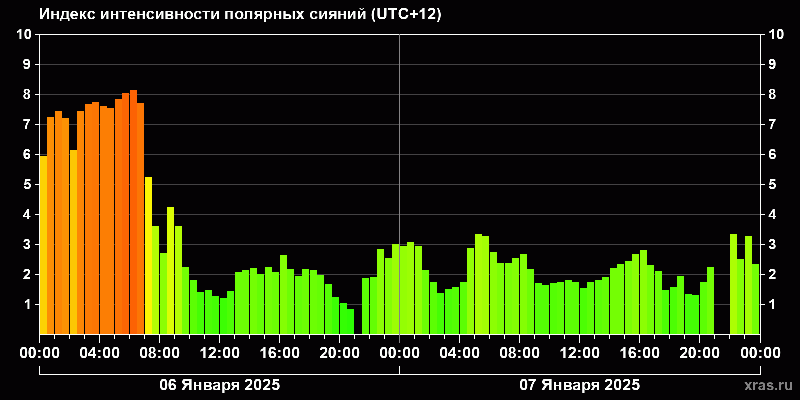 Изменения индекса интенсивности полярных сияний с 2025-01-06 по 2025-01-07 по местному времени