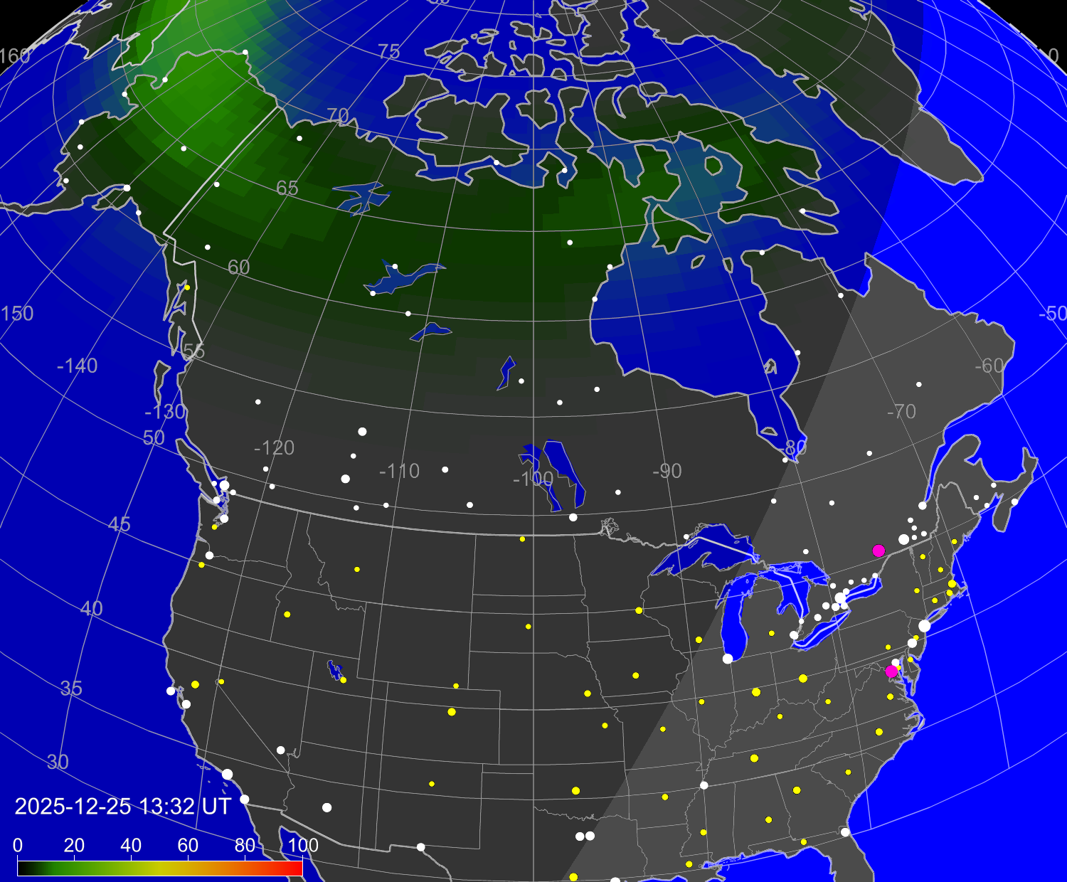Индекс интенсивности полярных сияний и теоретически возможная широта наблюдений для ночного времени в западном полушарии