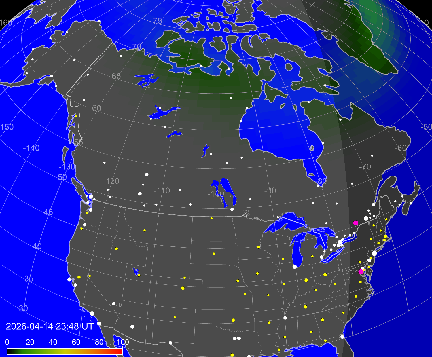 Вероятность полярных сияний в городах США