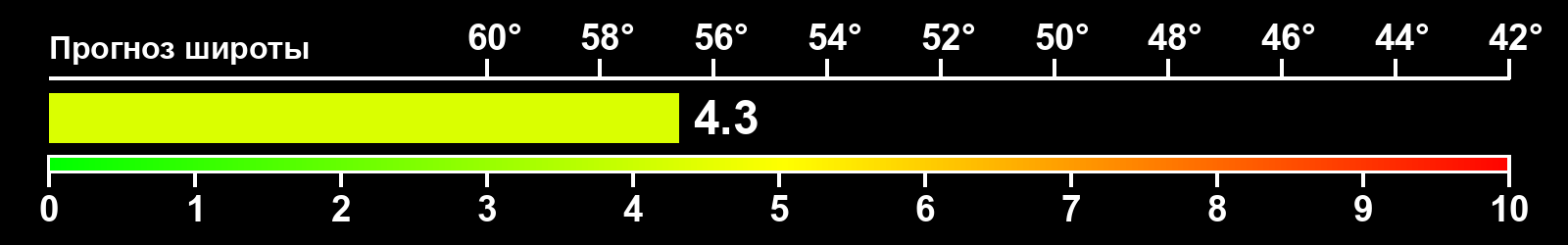 Индекс интенсивности полярных сияний и теоретически возможная широта наблюдений для ночного времени в западном полушарии по состоянию на 2025-12-03 23:47 (конец дня) по местному времени