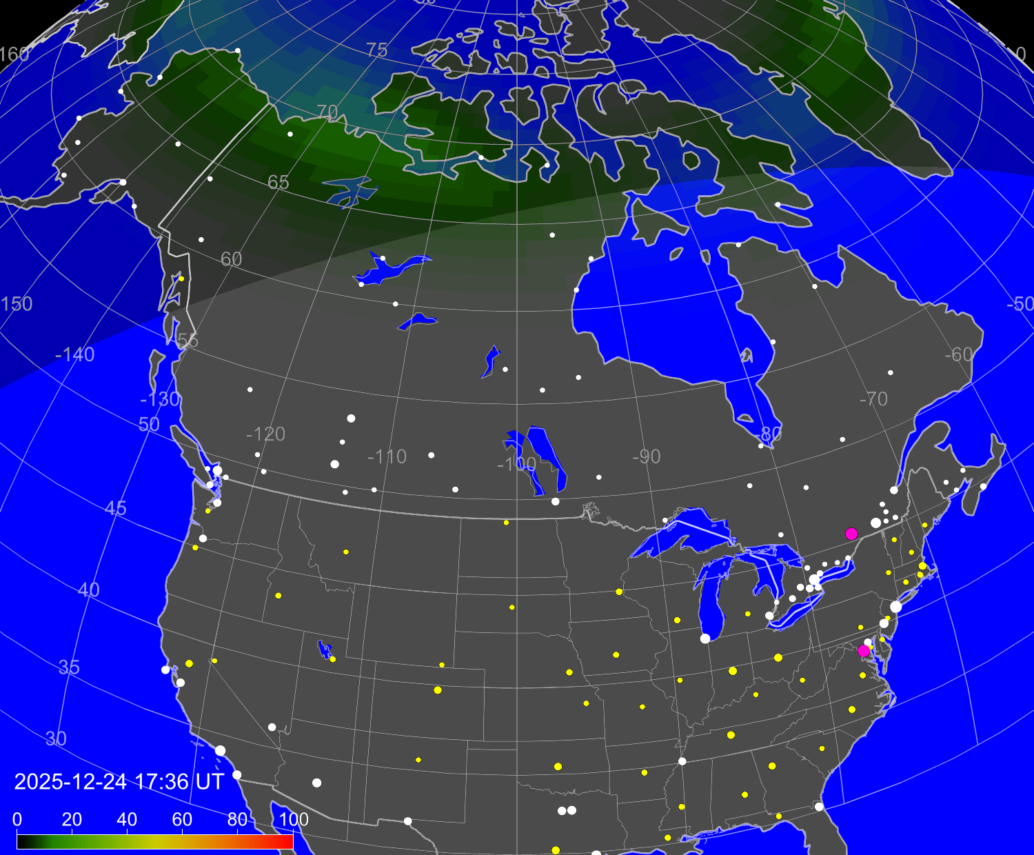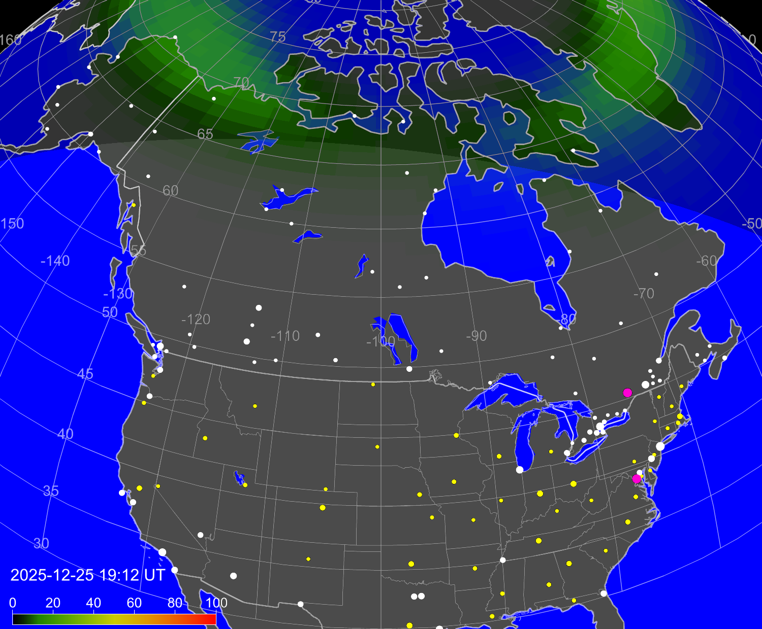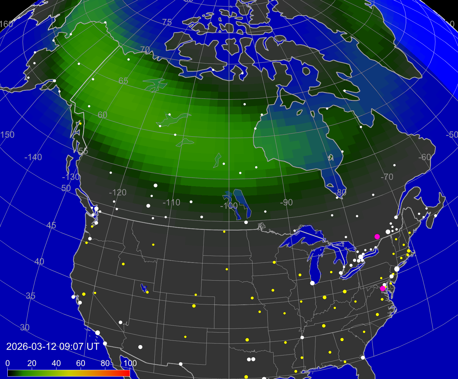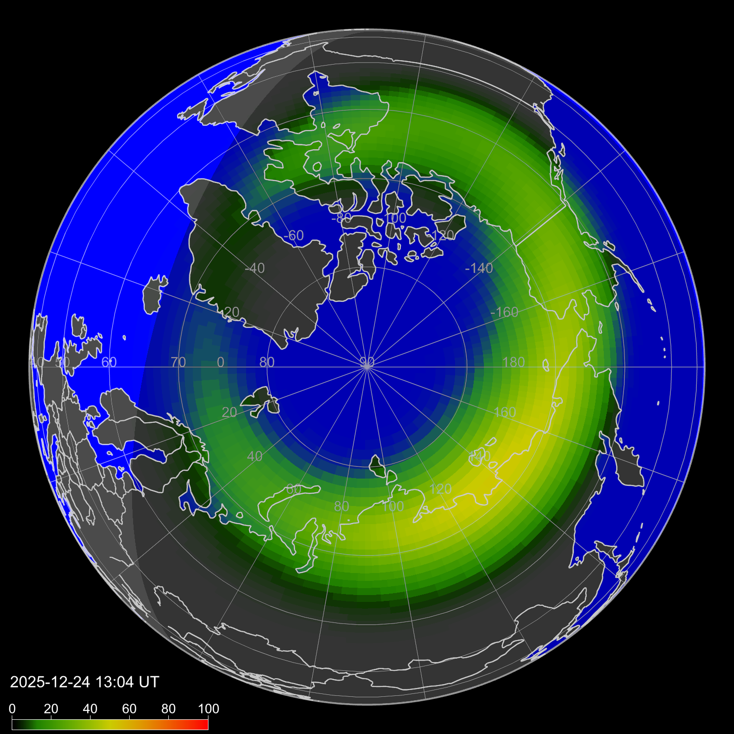 Индекс интенсивности полярных сияний и теоретически возможная широта наблюдений для ночного времени в западном полушарии