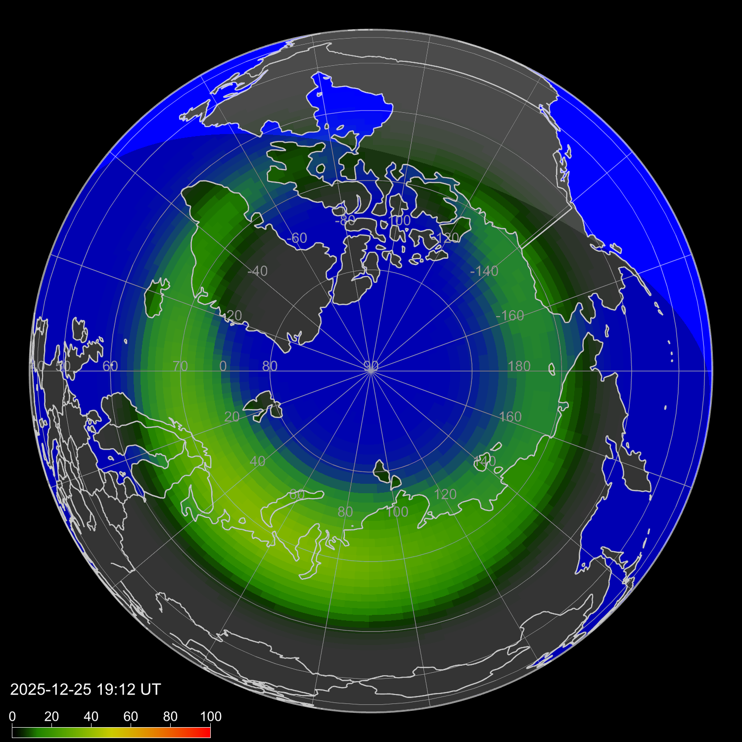Изменения и часовой прогноз индекса интенсивности полярных сияний с 2025-12-23 по 2025-12-24