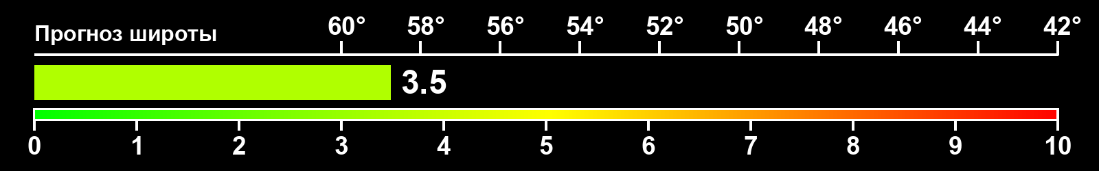 Индекс интенсивности полярных сияний и теоретически возможная широта наблюдений для ночного времени в западном полушарии по состоянию на 2026-03-21 23:47 (конец дня) по местному времени