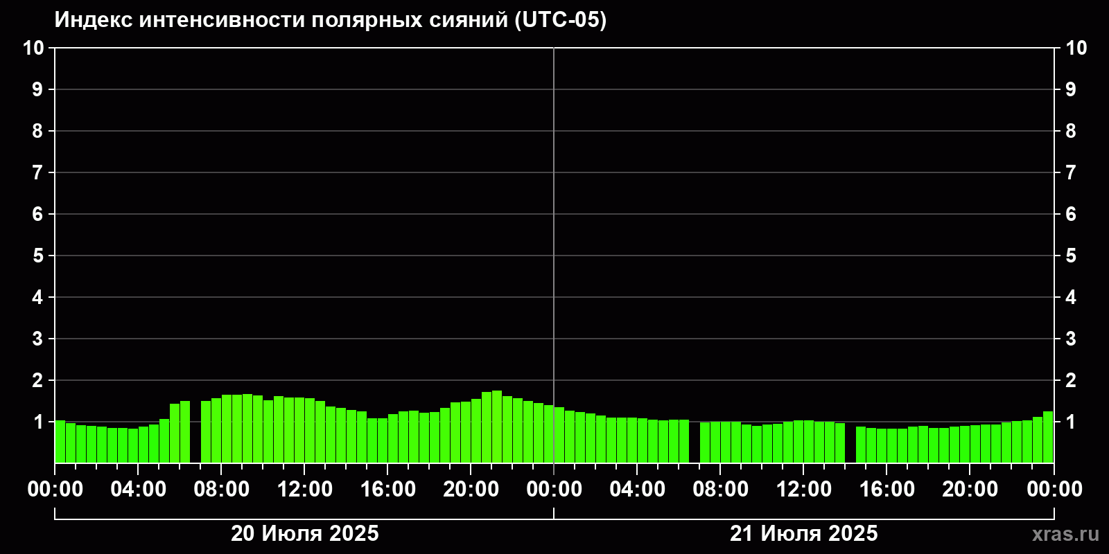 Изменения индекса интенсивности полярных сияний с 2025-07-20 по 2025-07-21 по местному времени