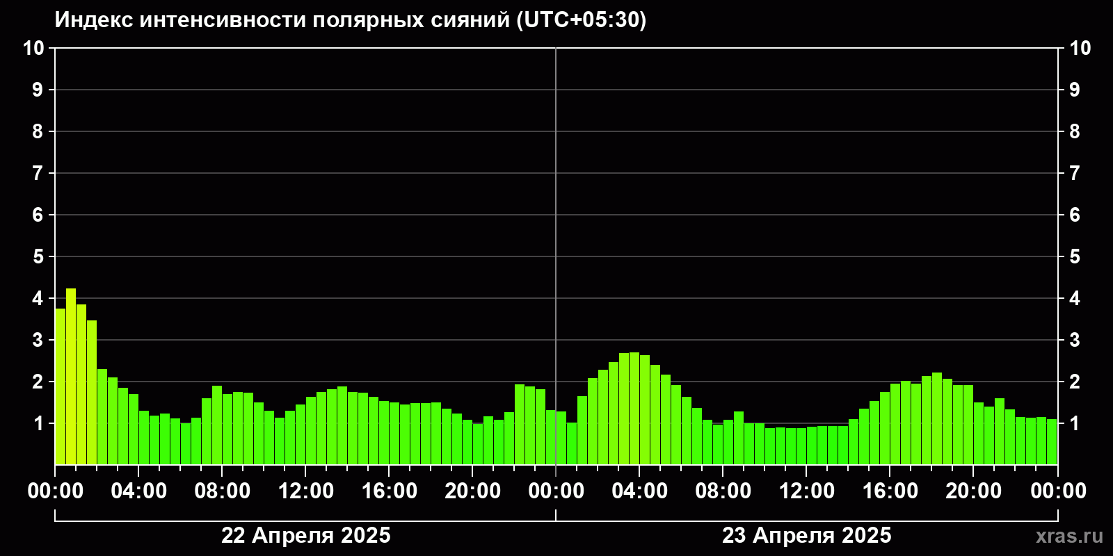 Изменения индекса интенсивности полярных сияний с 2025-04-22 по 2025-04-23 по местному времени