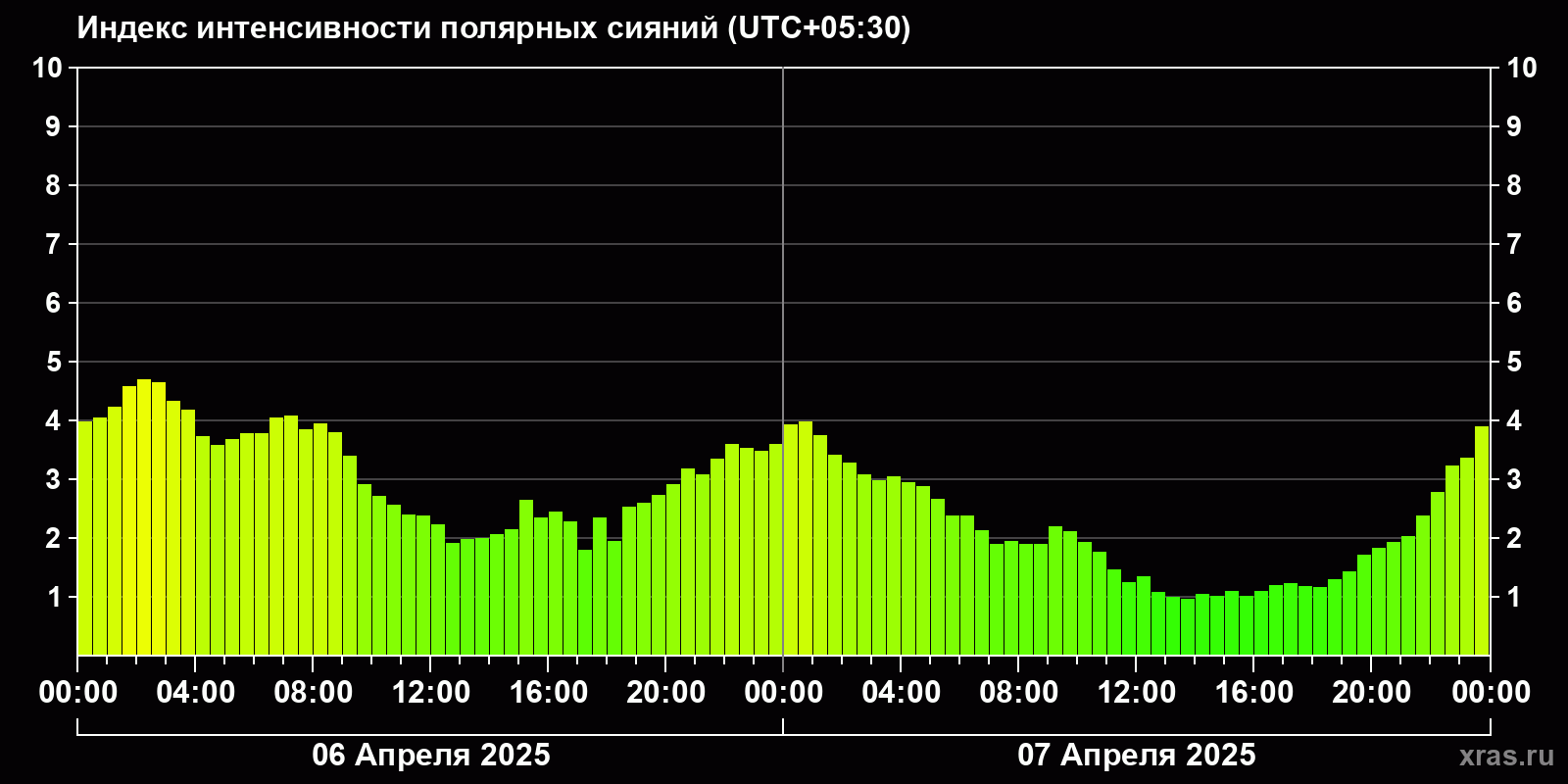 Изменения индекса интенсивности полярных сияний с 2025-04-06 по 2025-04-07 по местному времени