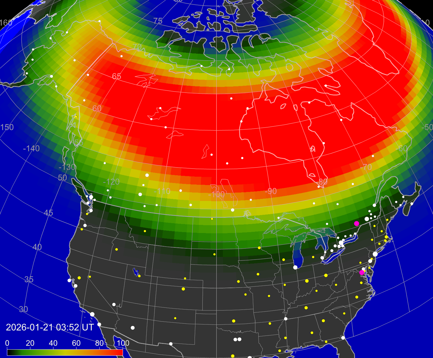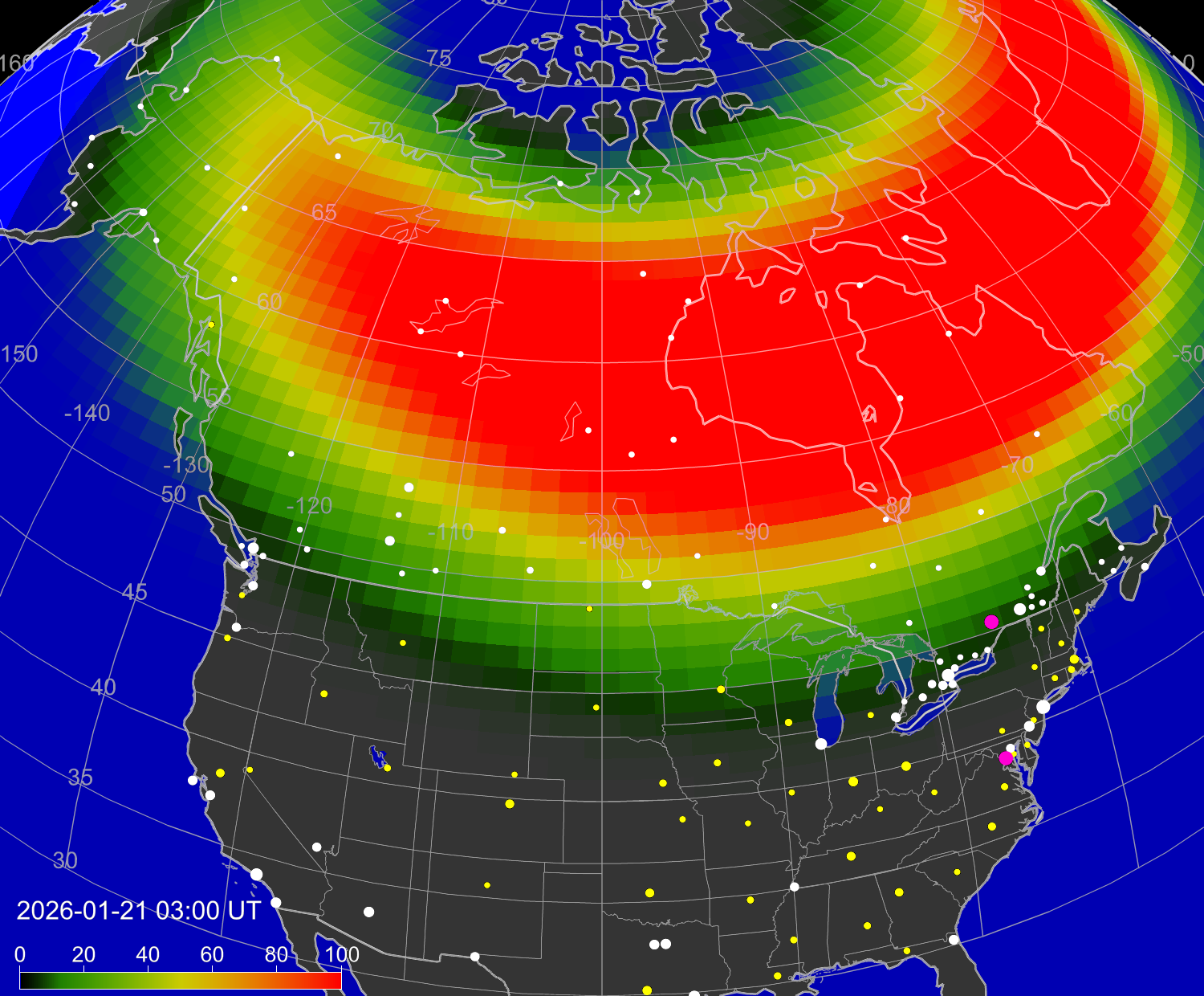 Изменения и часовой прогноз индекса интенсивности полярных сияний с 2026-01-20 по 2026-01-21