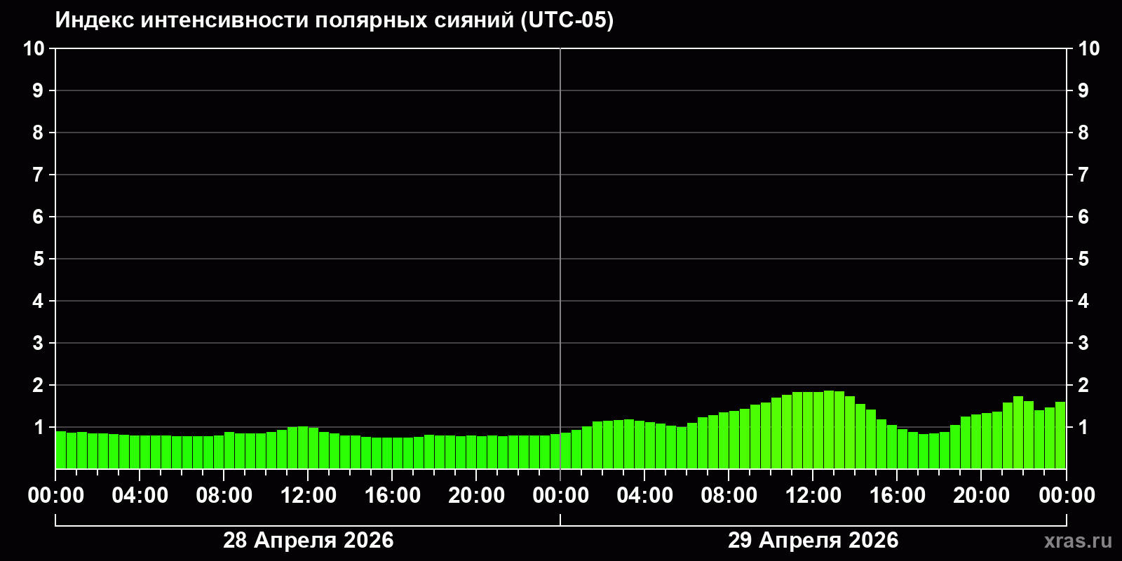 Изменения индекса интенсивности полярных сияний с 2026-04-28 по 2026-04-29 по местному времени