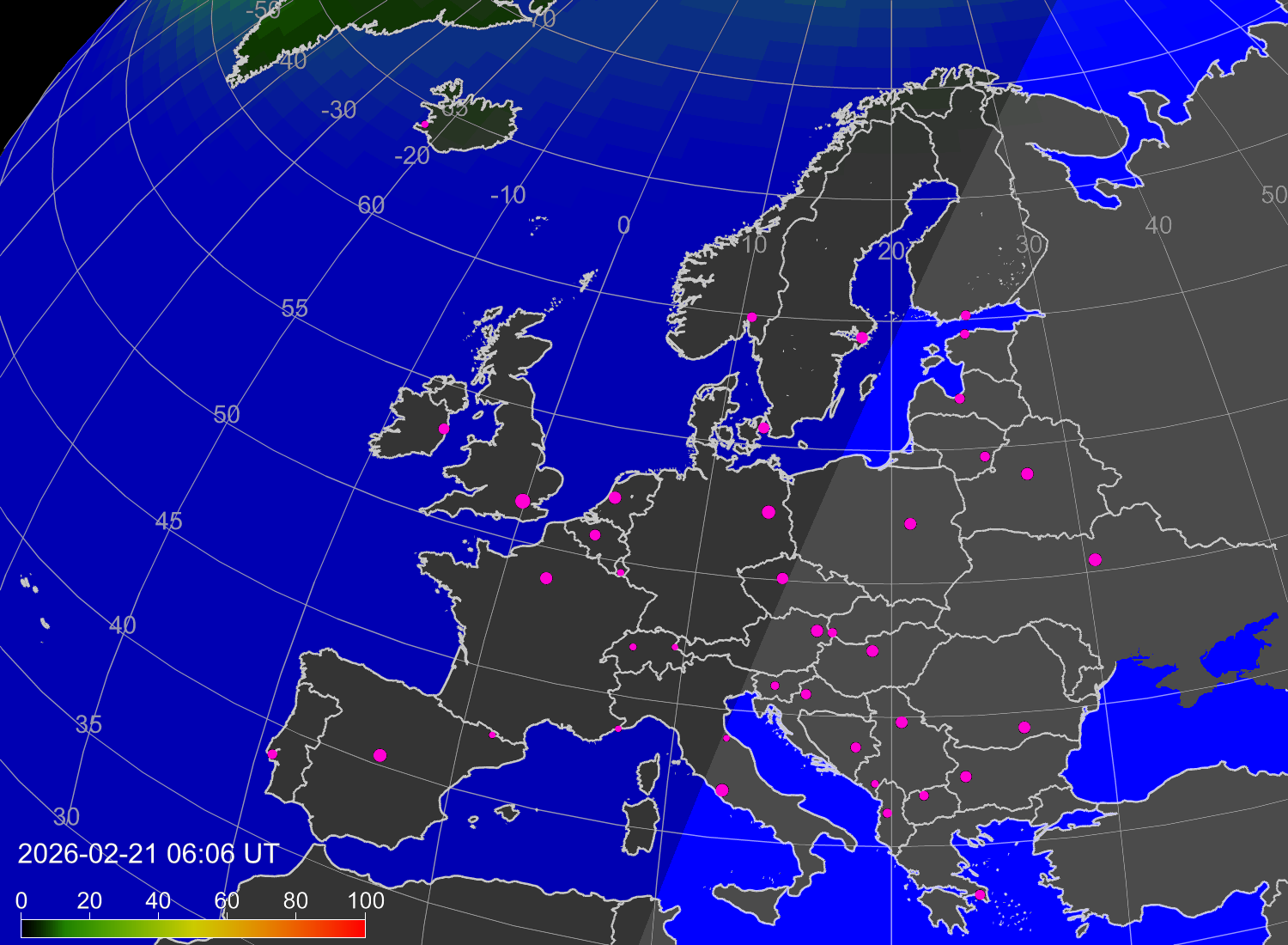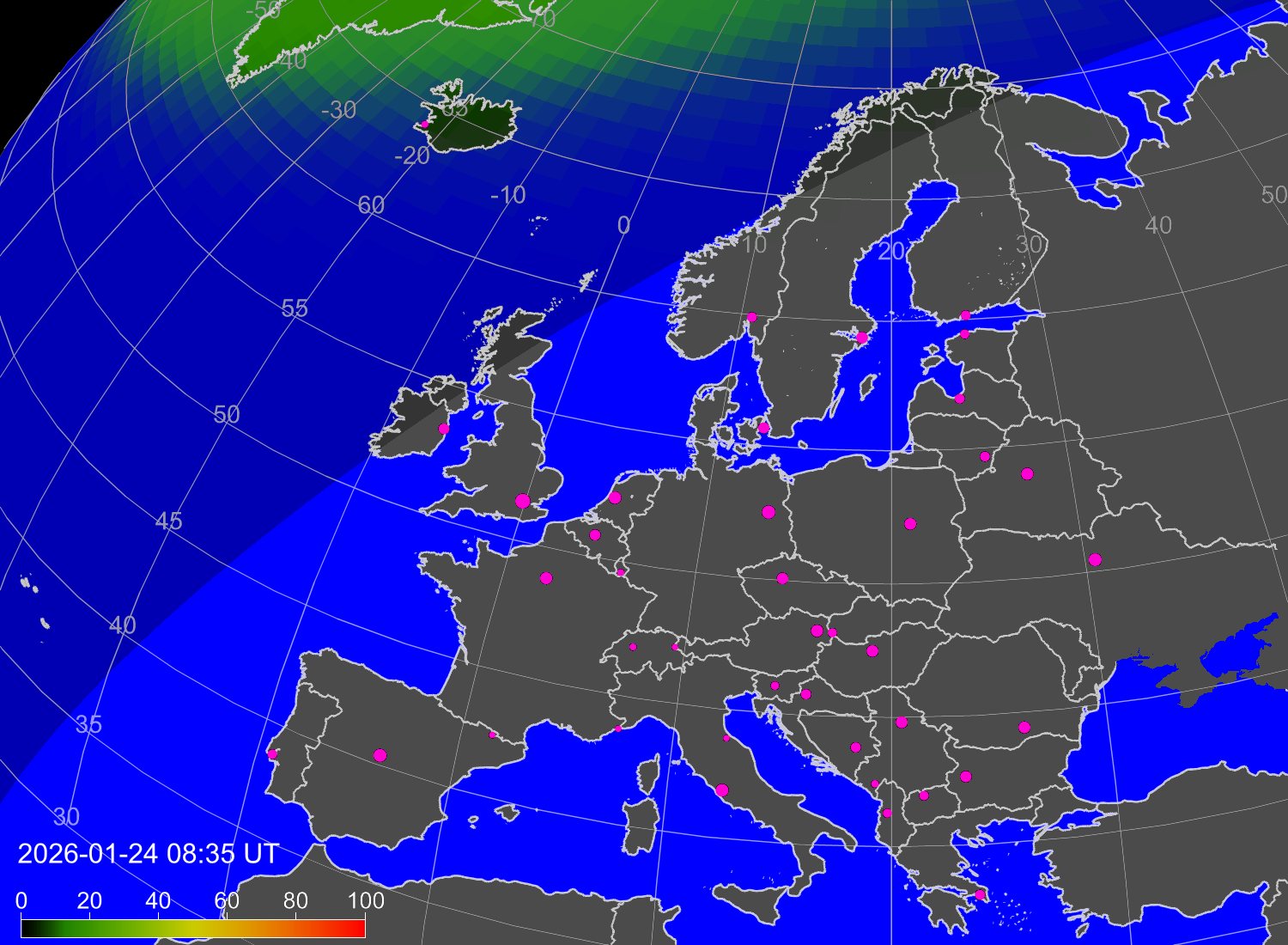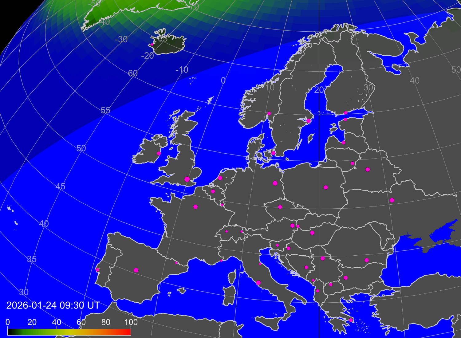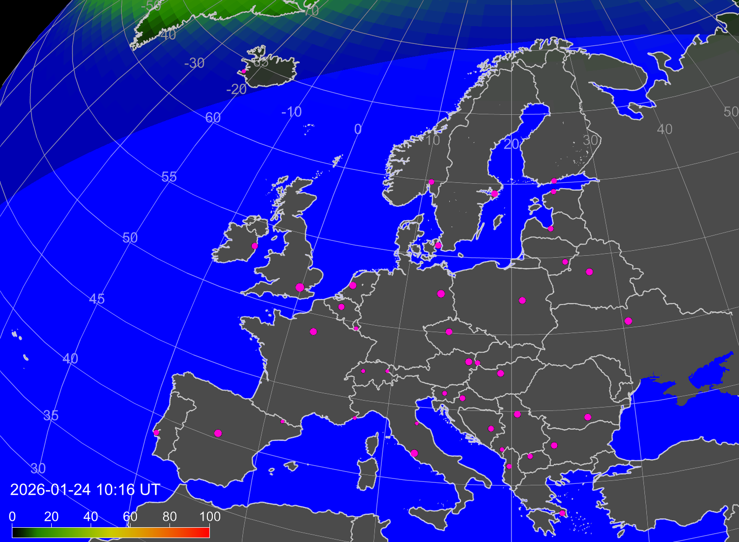 Индекс интенсивности полярных сияний и теоретически возможная широта наблюдений для ночного времени в восточном полушарии