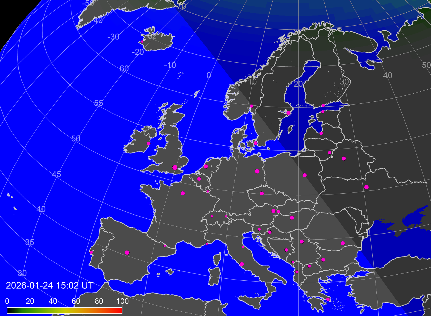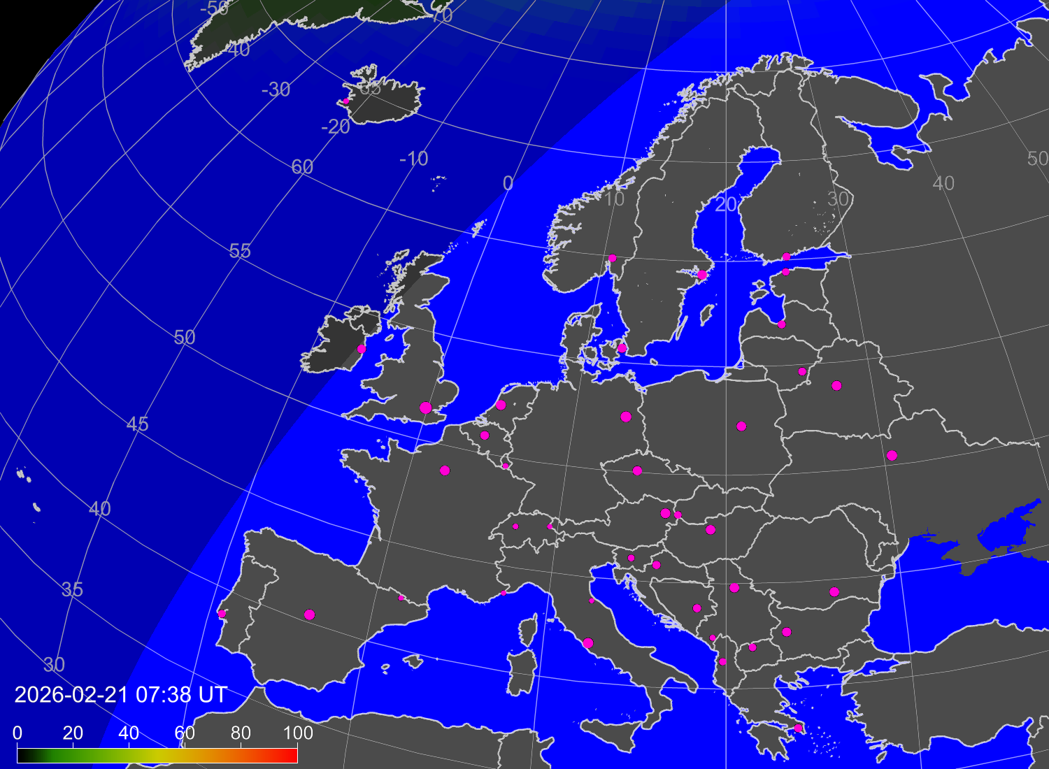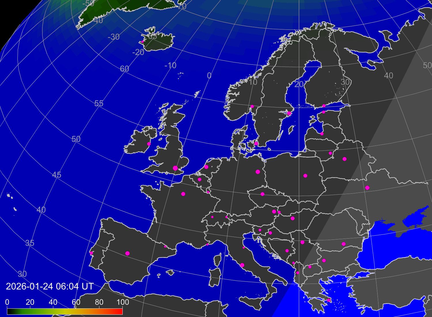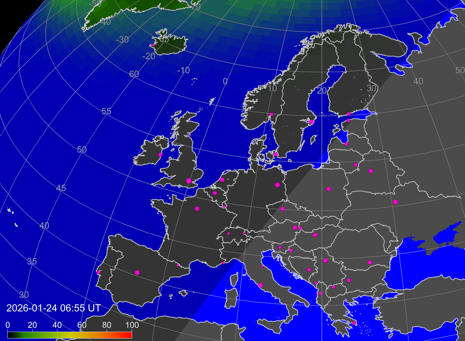 Индекс интенсивности полярных сияний и теоретически возможная широта наблюдений для ночного времени в восточном полушарии