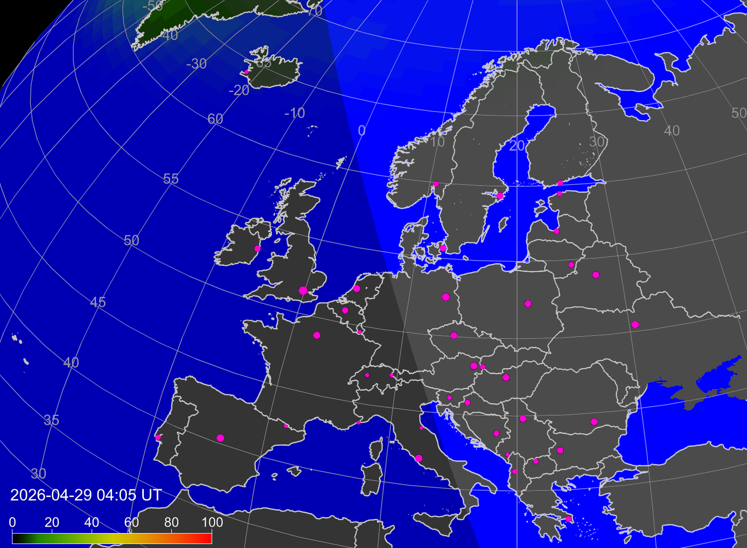 Вероятность полярных сияний в городах Европы