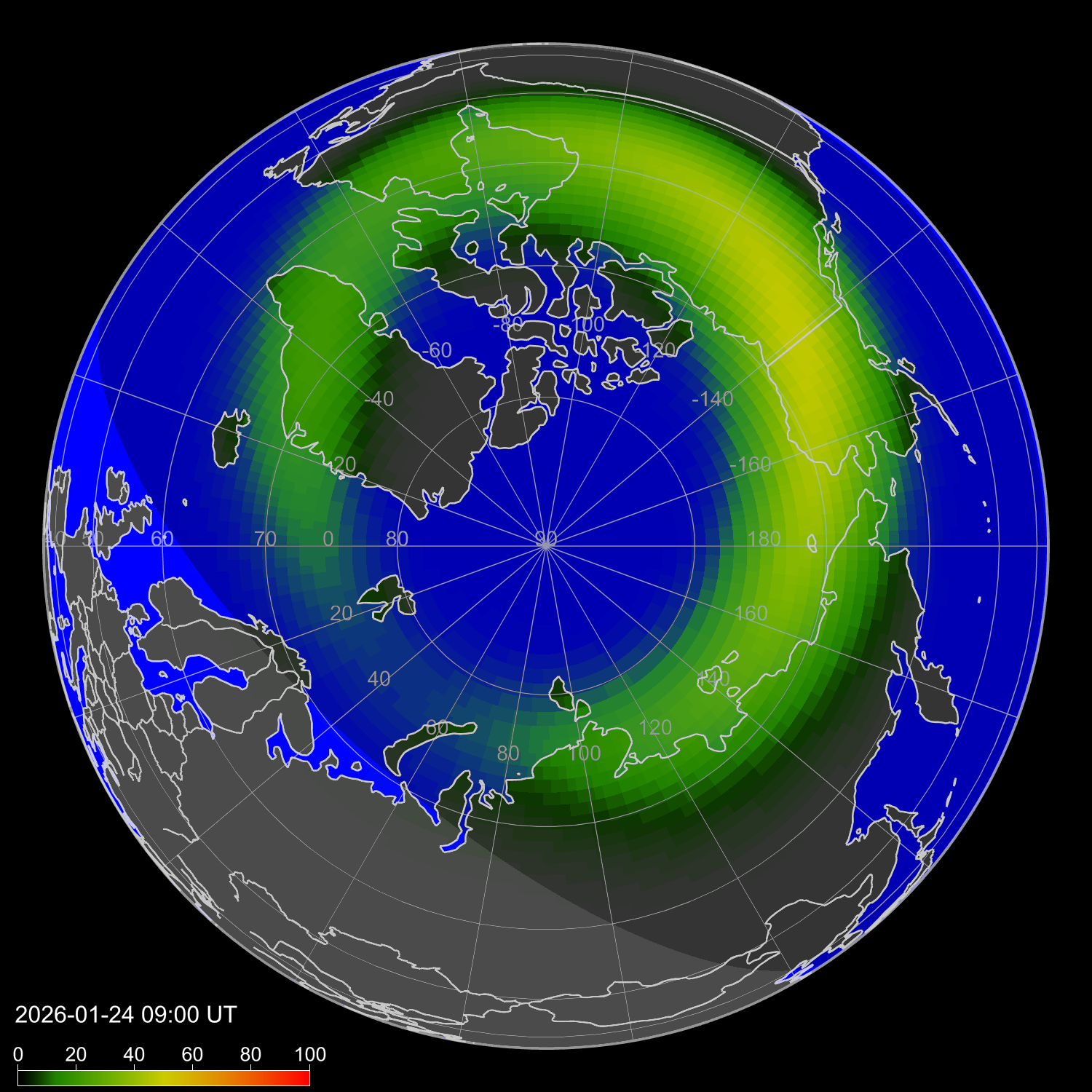 Изменения и часовой прогноз индекса интенсивности полярных сияний с 2026-01-23 по 2026-01-24