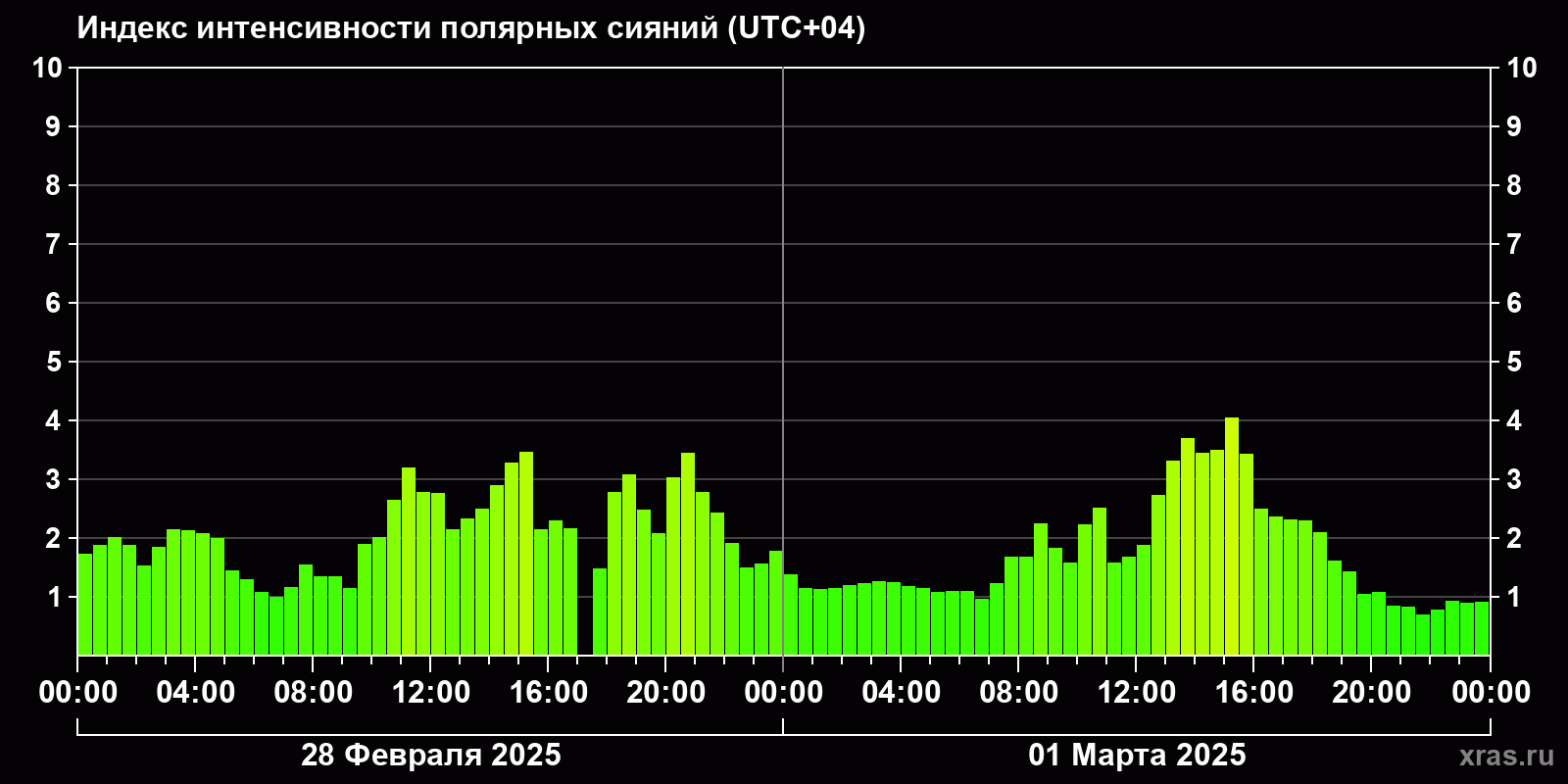 Изменения индекса интенсивности полярных сияний с 2025-02-28 по 2025-03-01 по местному времени