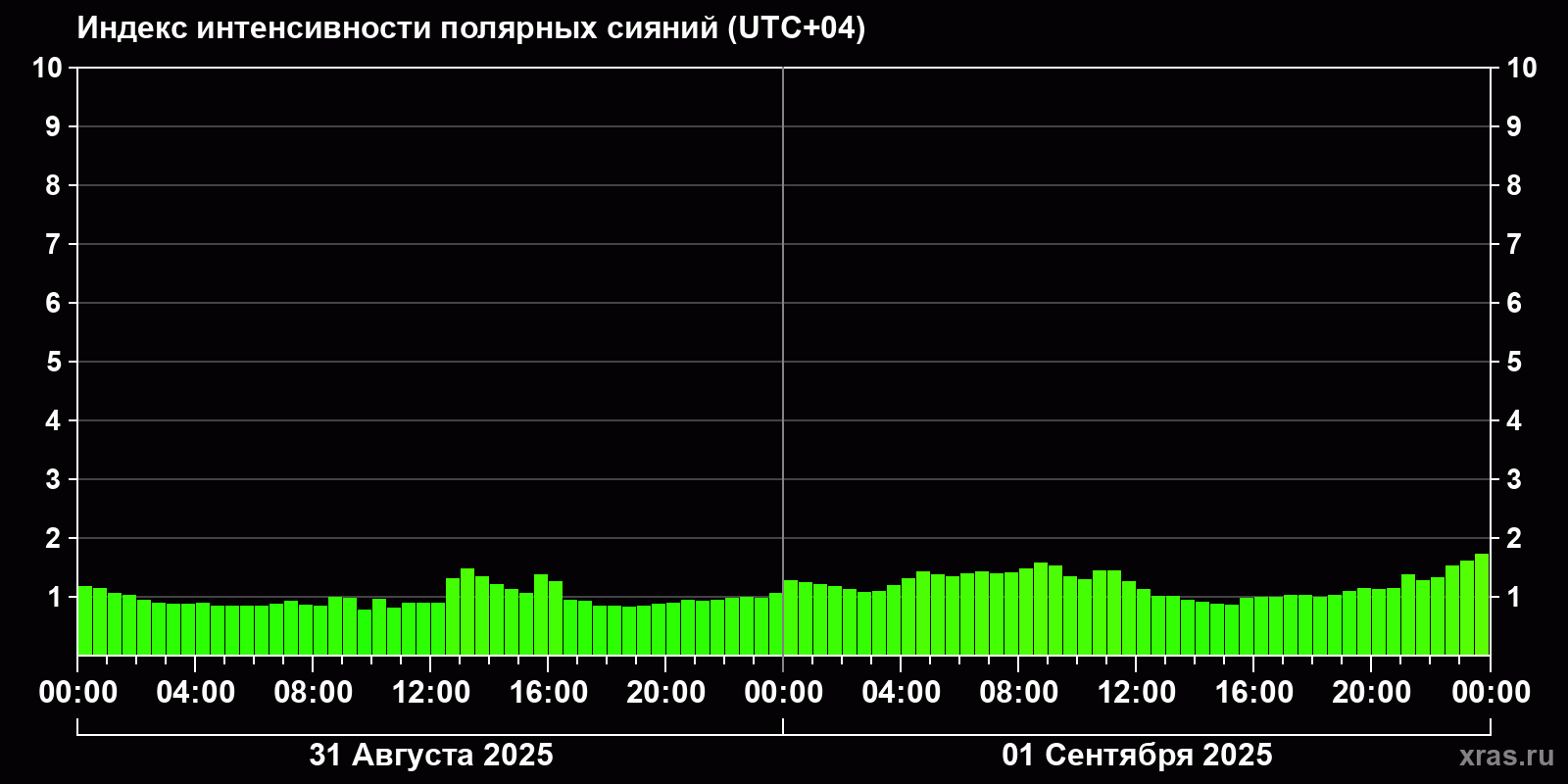 Изменения индекса интенсивности полярных сияний с 2025-09-01 по 2025-09-02 по местному времени