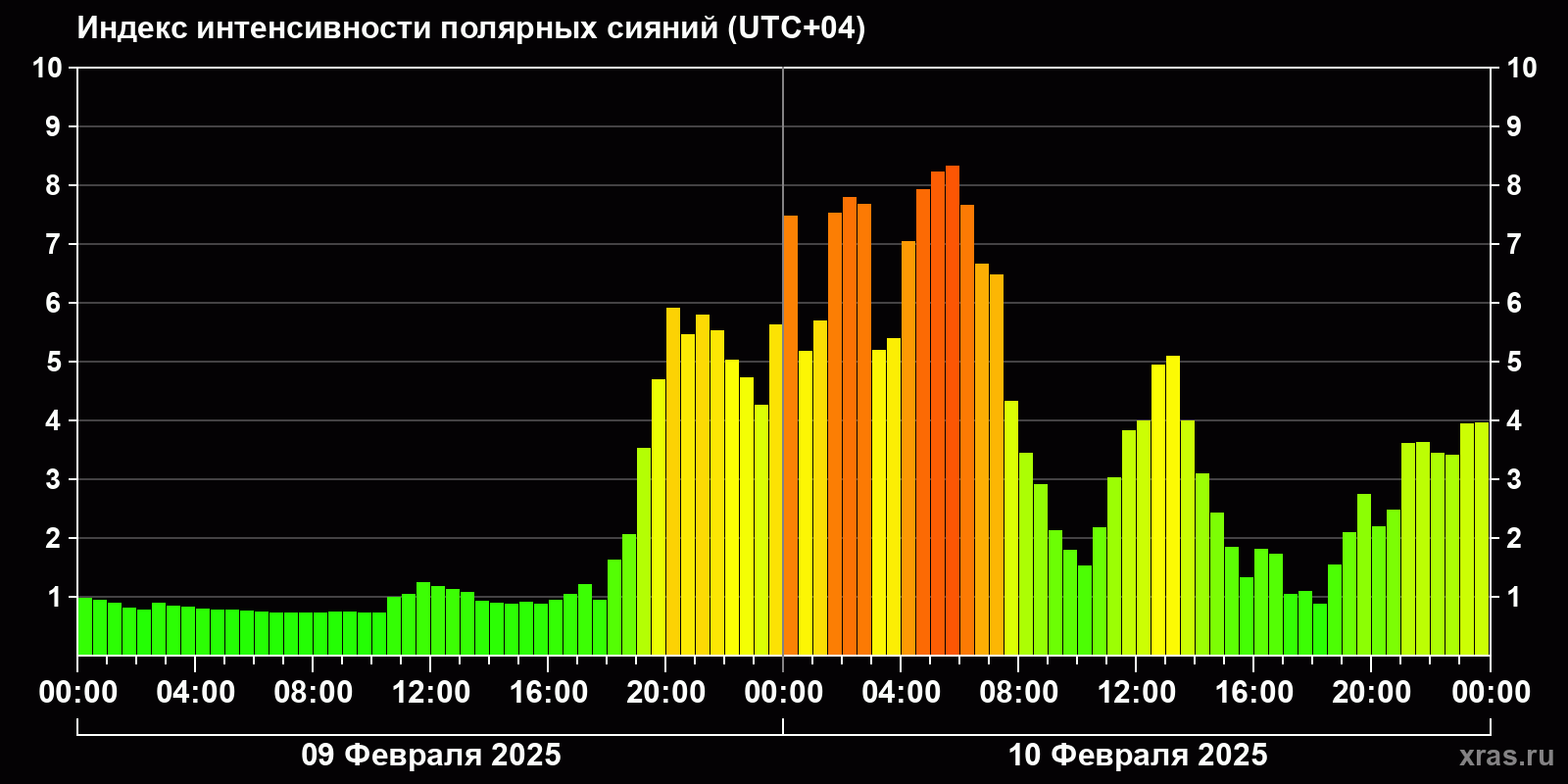 Изменения индекса интенсивности полярных сияний с 2025-02-09 по 2025-02-10 по местному времени