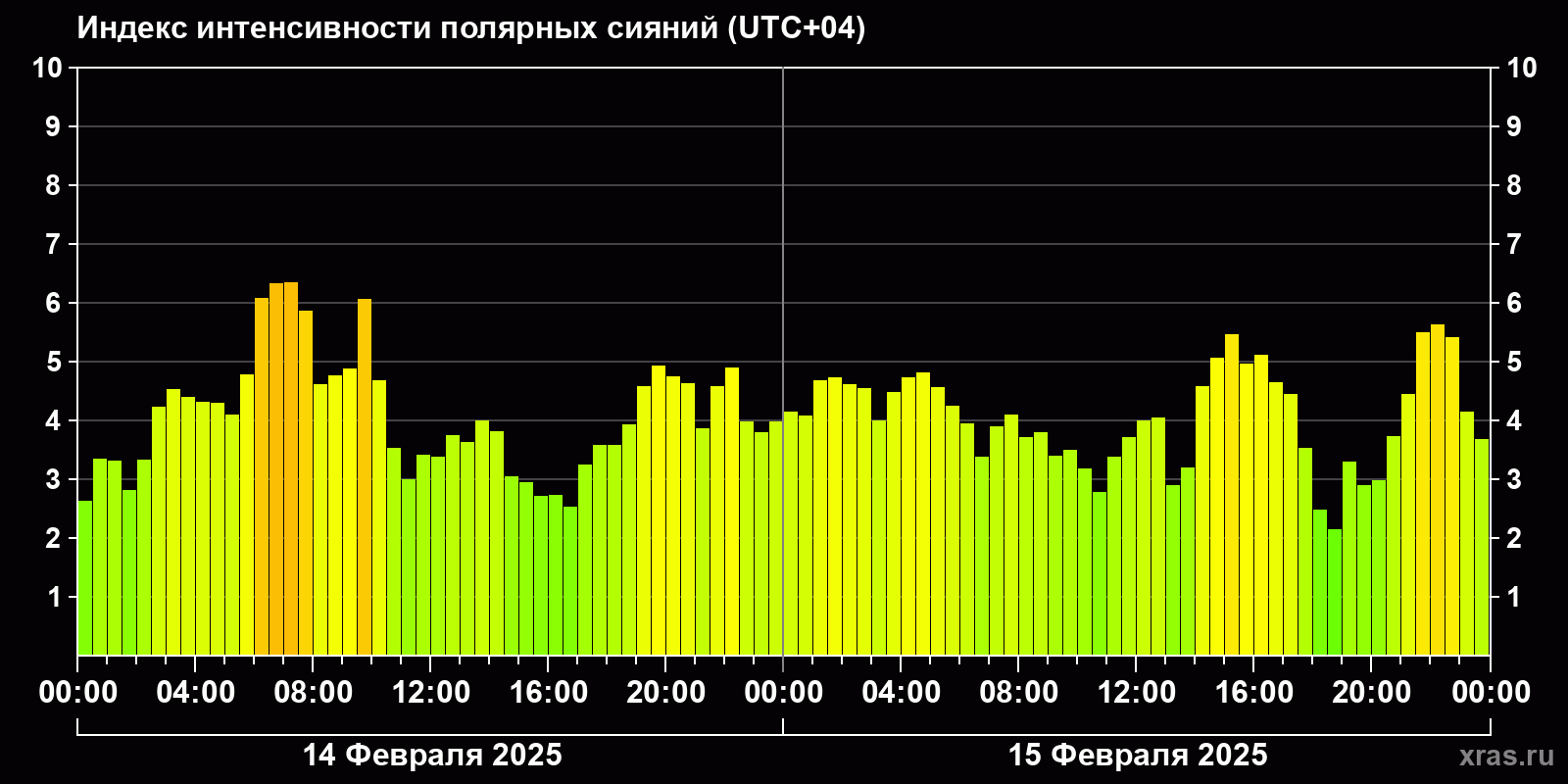 Изменения индекса интенсивности полярных сияний с 2025-02-14 по 2025-02-15 по местному времени