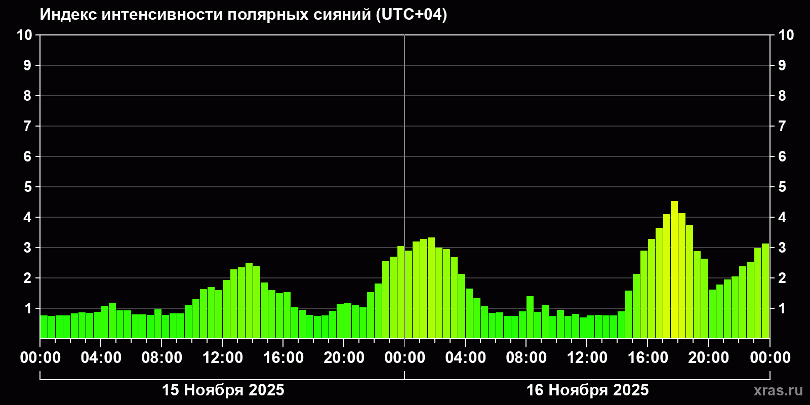 Изменения индекса интенсивности полярных сияний с 2025-11-15 по 2025-11-16 по местному времени