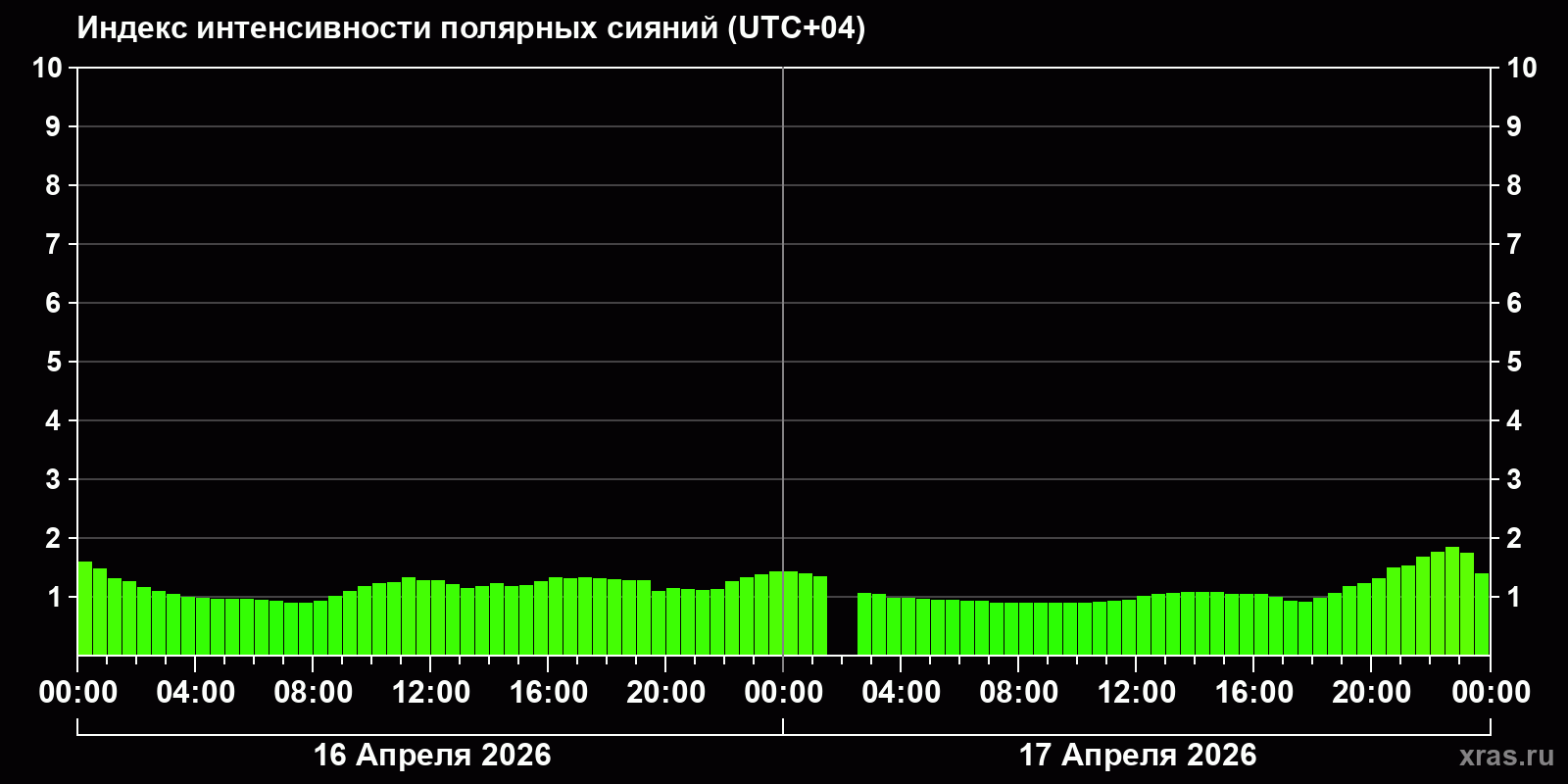 Изменения индекса интенсивности полярных сияний с 2026-04-17 по 2026-04-18 по местному времени