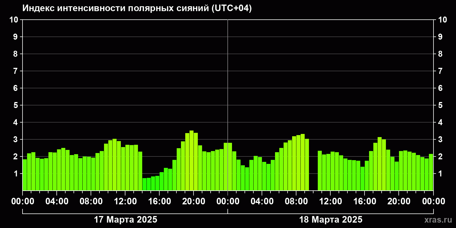 Изменения индекса интенсивности полярных сияний с 2025-03-17 по 2025-03-18 по местному времени