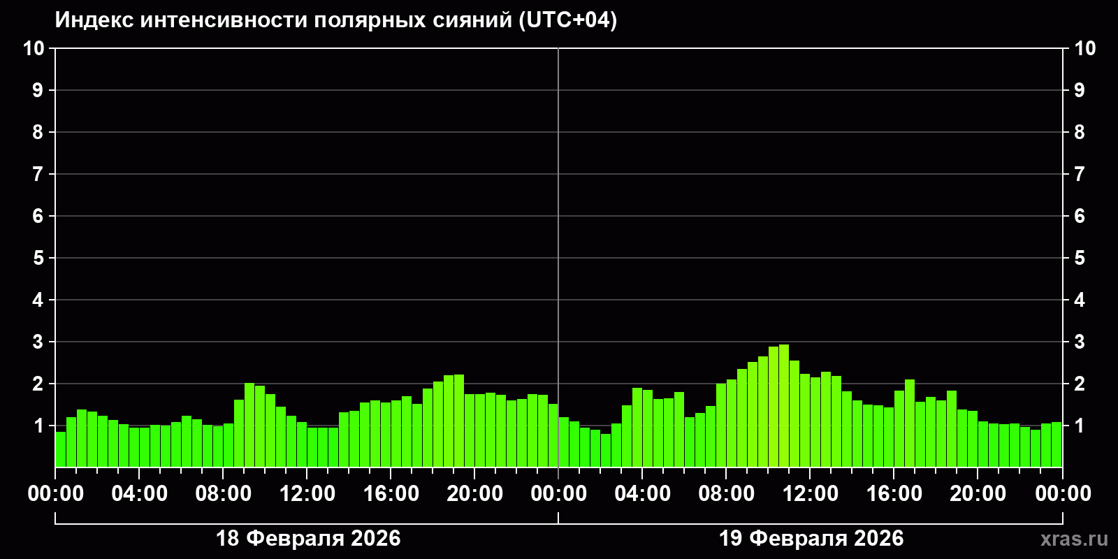 Изменения индекса интенсивности полярных сияний с 2026-02-18 по 2026-02-19 по местному времени
