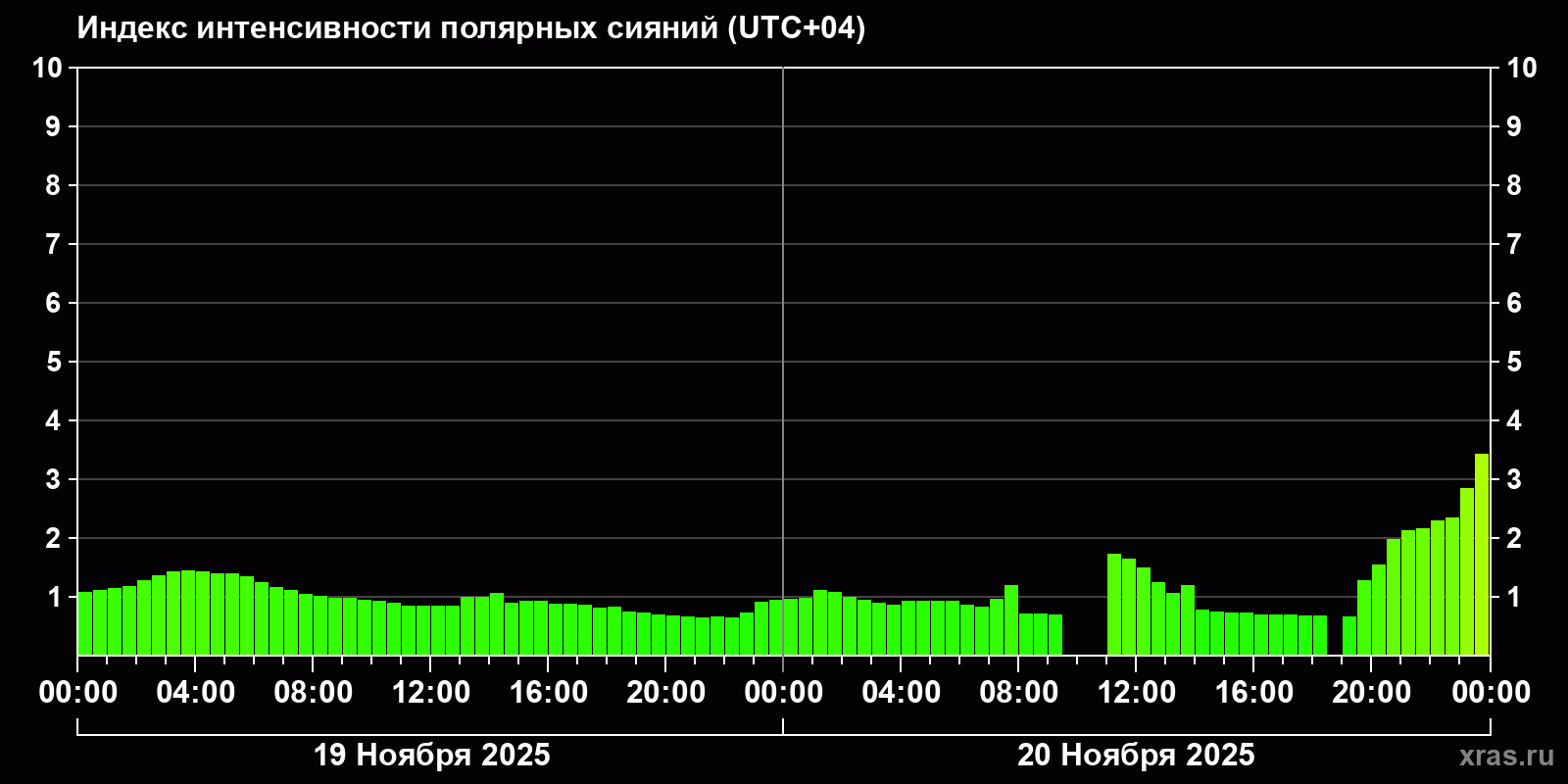 Изменения индекса интенсивности полярных сияний с 2025-11-19 по 2025-11-20 по местному времени