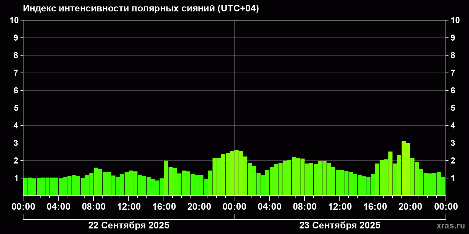 Изменения индекса интенсивности полярных сияний с 2025-09-23 по 2025-09-24 по местному времени