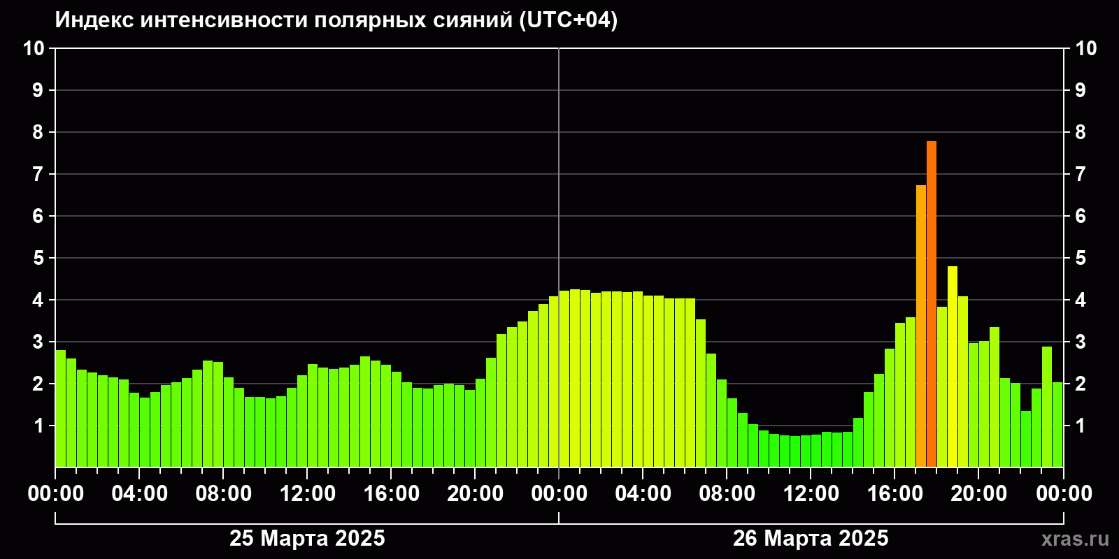 Изменения индекса интенсивности полярных сияний с 2025-03-25 по 2025-03-26 по местному времени