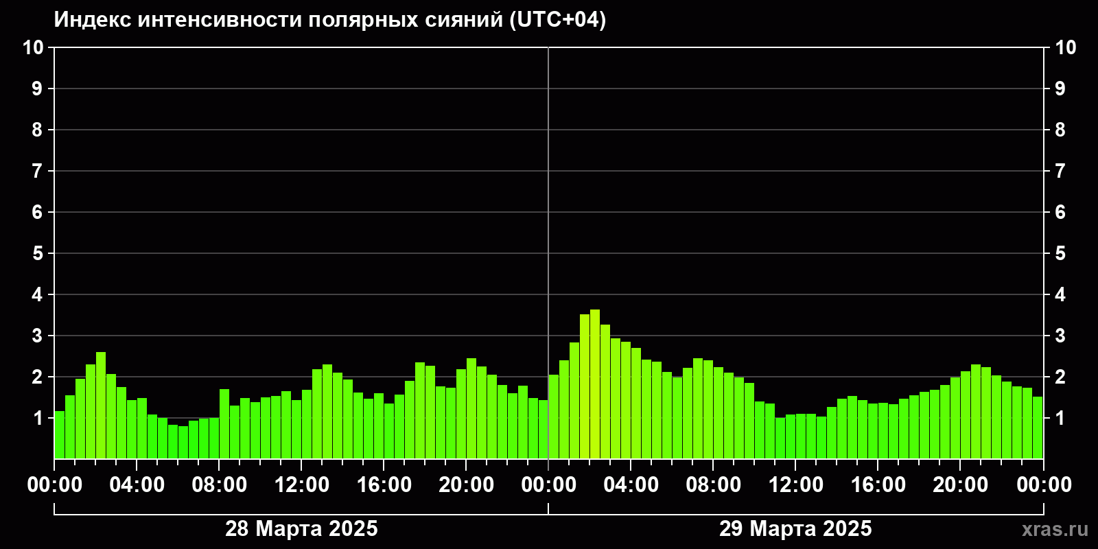 Изменения индекса интенсивности полярных сияний с 2025-03-28 по 2025-03-29 по местному времени