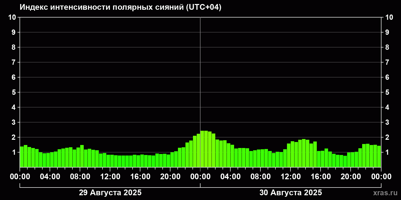 Изменения индекса интенсивности полярных сияний с 2025-08-30 по 2025-08-31 по местному времени