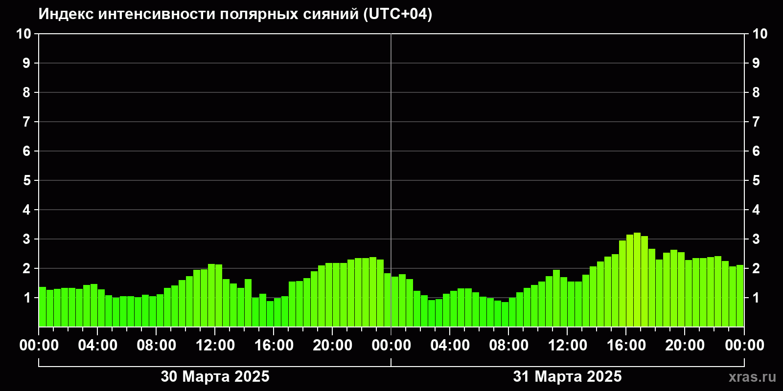 Изменения индекса интенсивности полярных сияний с 2025-03-31 по 2025-04-01 по местному времени