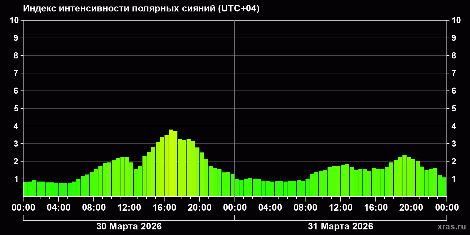 Изменения индекса интенсивности полярных сияний с 2026-03-31 по 2026-04-01 по местному времени
