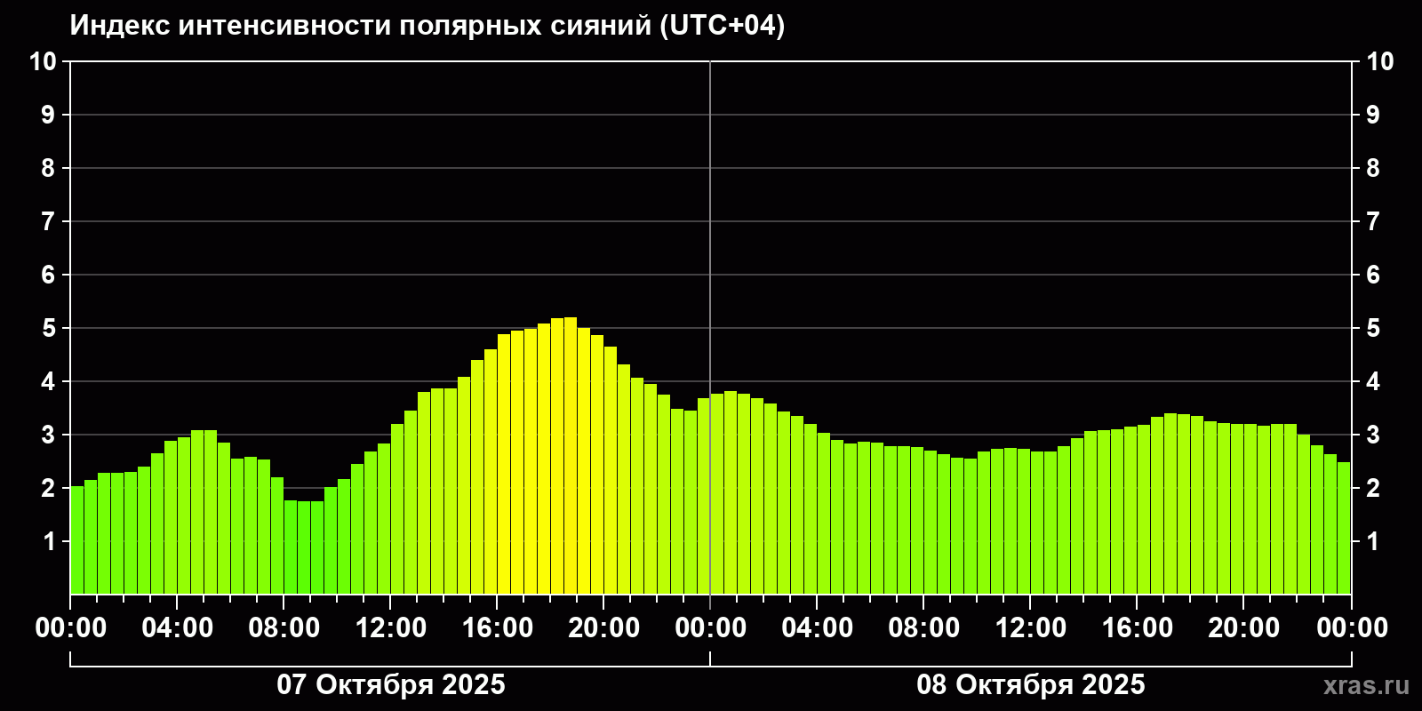 Изменения индекса интенсивности полярных сияний с 2025-10-08 по 2025-10-09 по местному времени