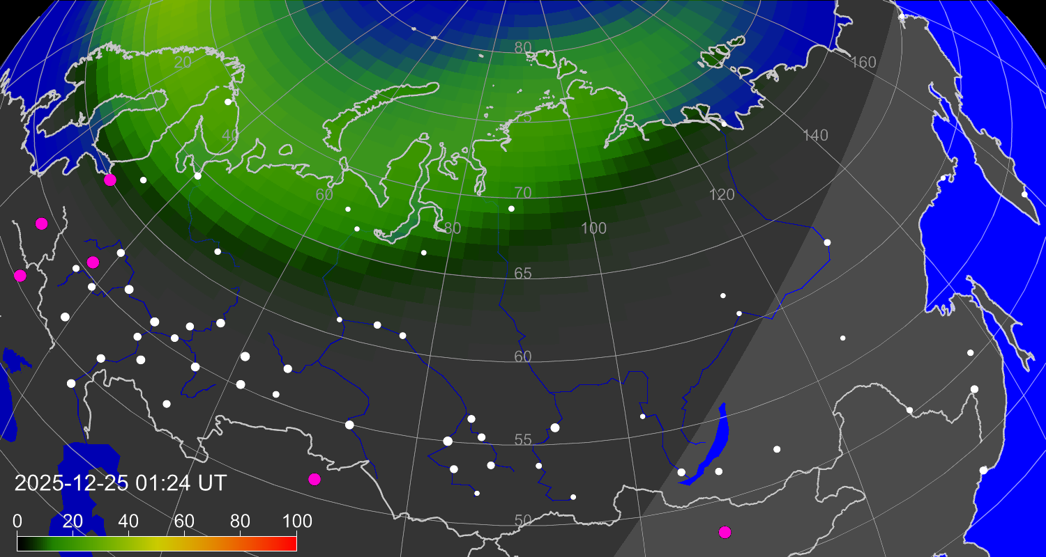 Изменения и часовой прогноз индекса интенсивности полярных сияний с 2025-12-24 по 2025-12-25