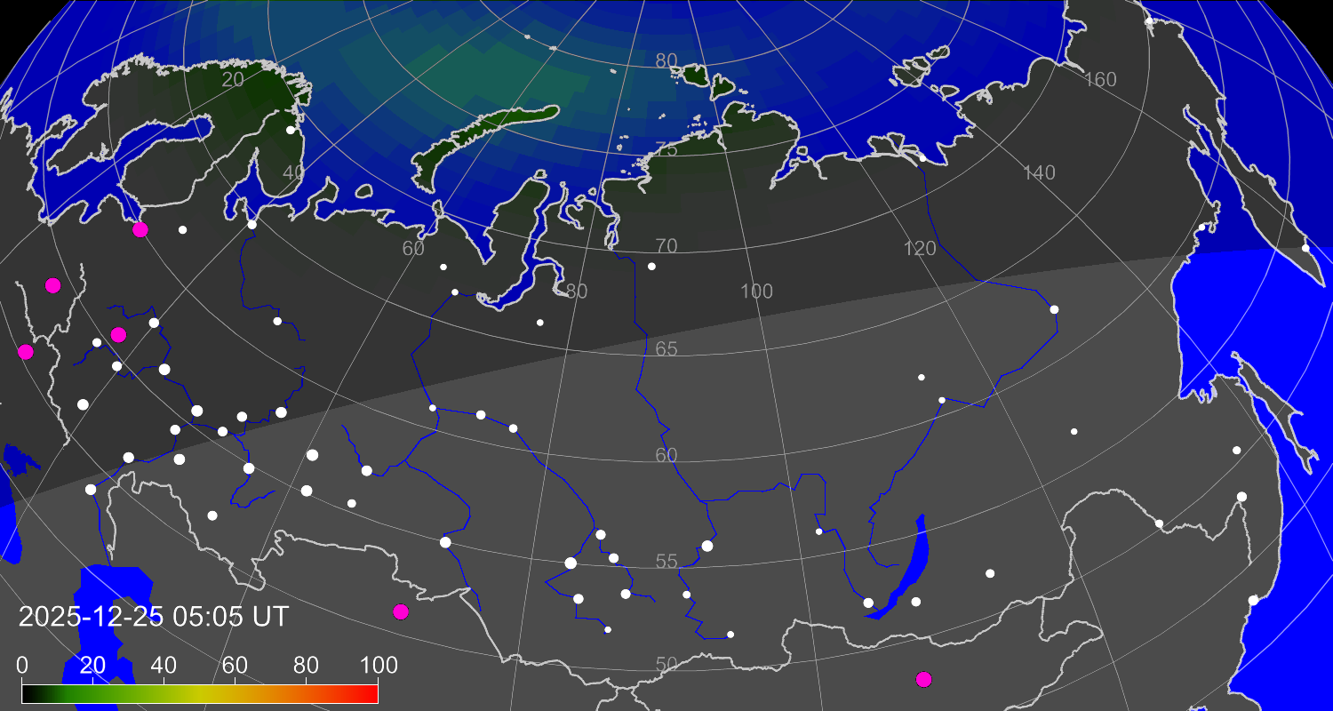 Индекс интенсивности полярных сияний и теоретически возможная широта наблюдений для ночного времени в восточном полушарии