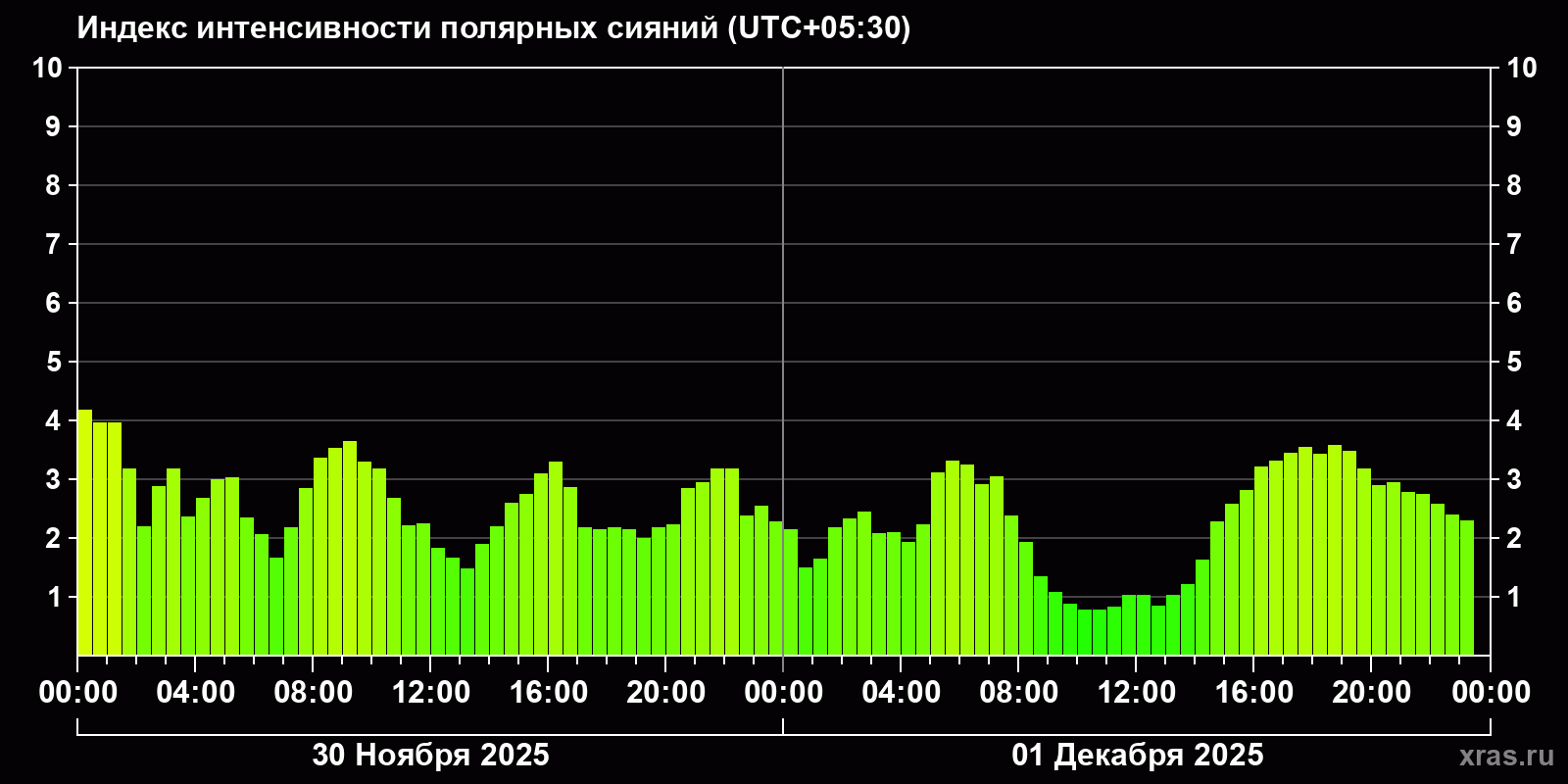 Изменения индекса интенсивности полярных сияний с 2025-11-30 по 2025-12-01 по местному времени