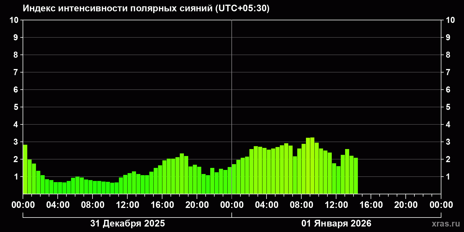 Изменения индекса интенсивности полярных сияний с 2025-12-31 по 2026-01-01 по местному времени