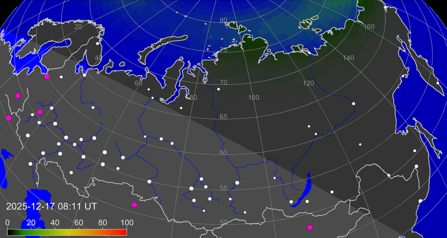 Индекс интенсивности полярных сияний и теоретически возможная широта наблюдений для ночного времени в восточном полушарии