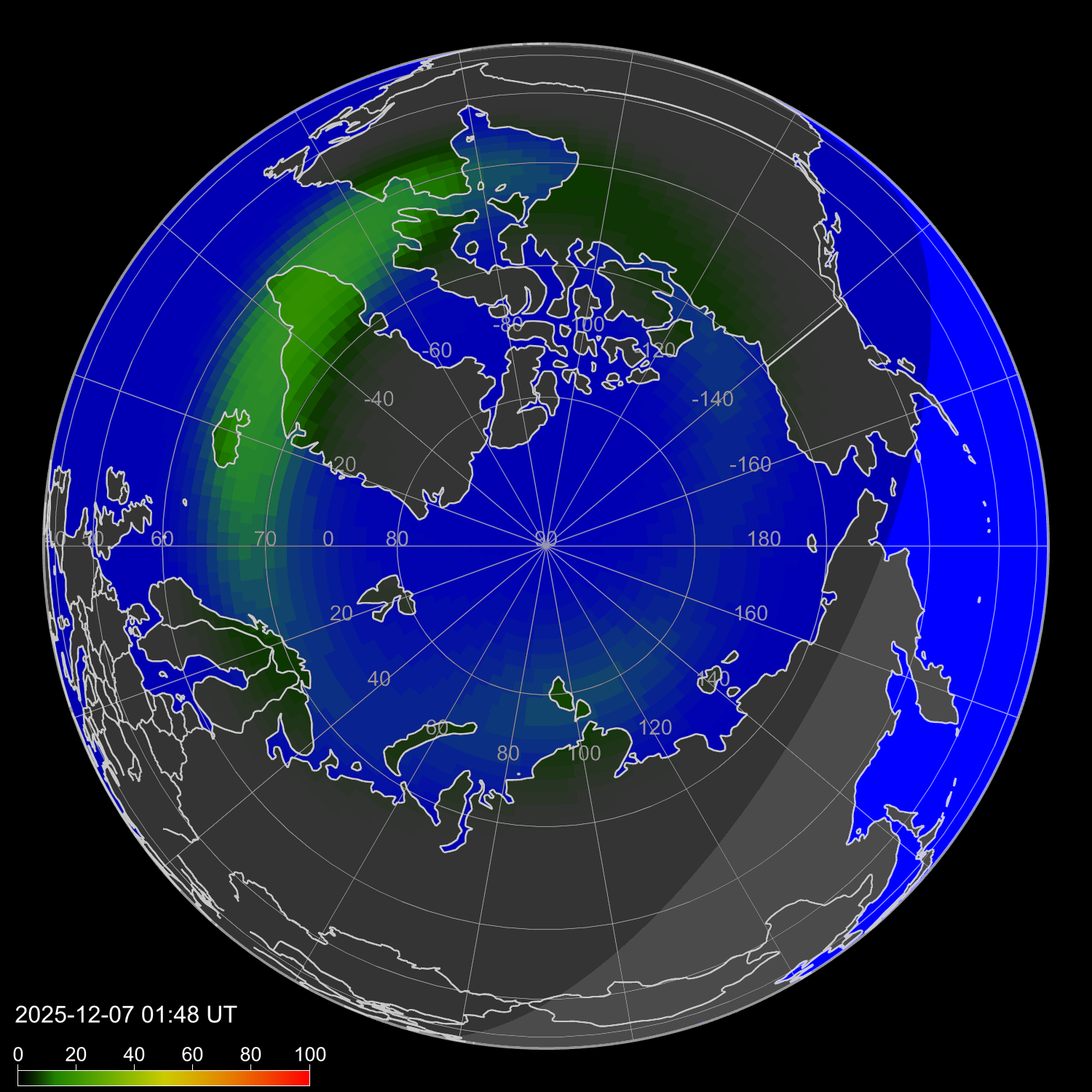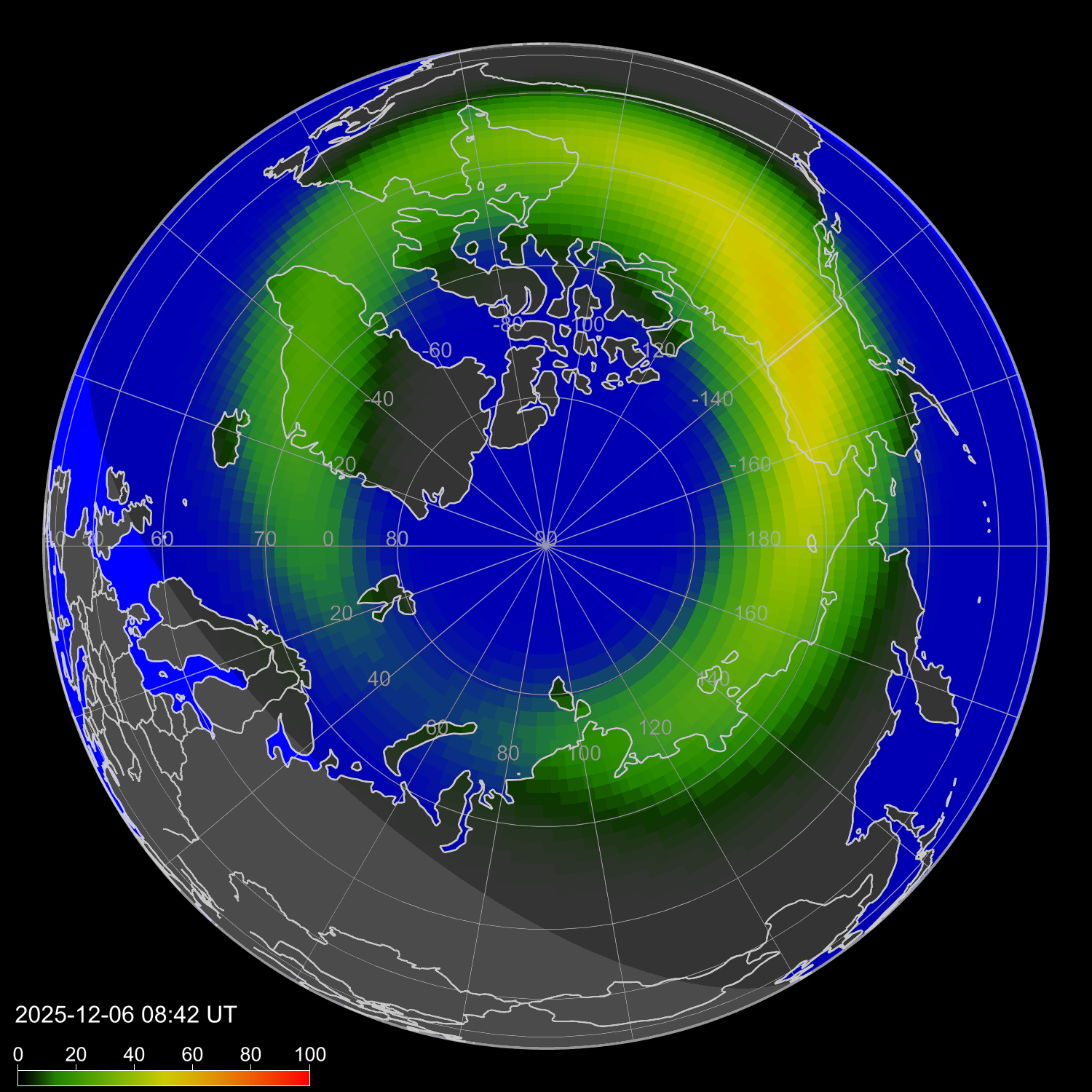 Изменения и часовой прогноз индекса интенсивности полярных сияний с 2025-12-05 по 2025-12-06