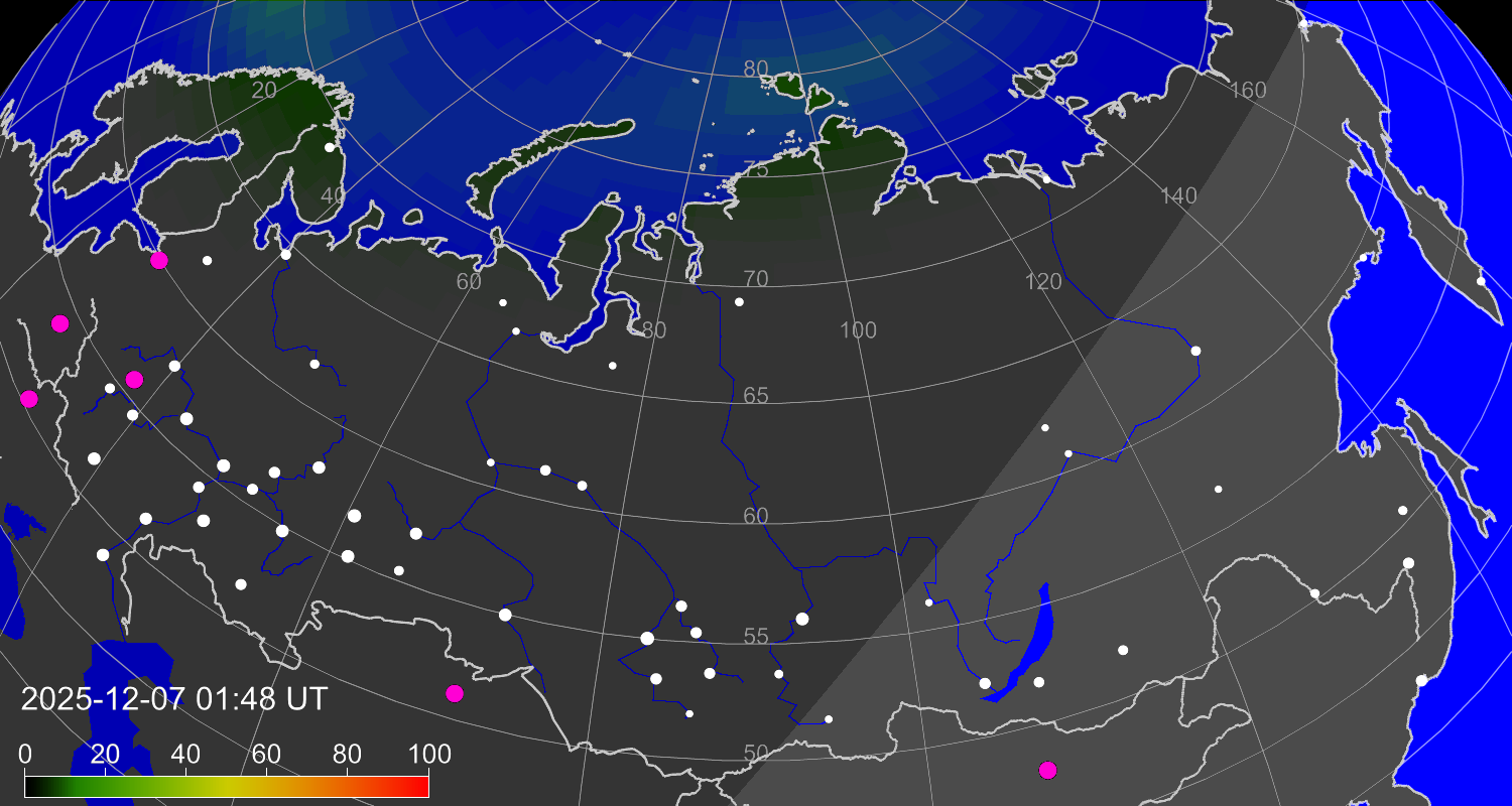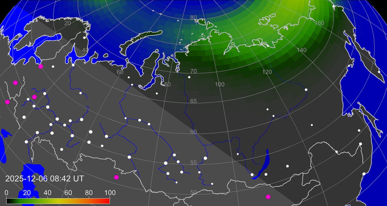 Индекс интенсивности полярных сияний и теоретически возможная широта наблюдений для ночного времени в восточном полушарии