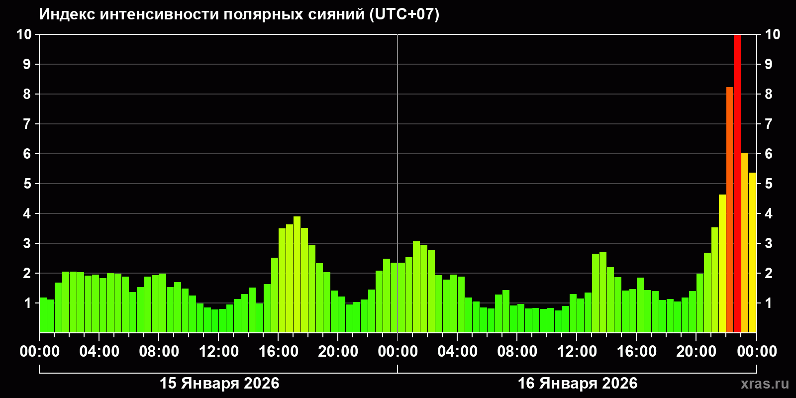 Изменения индекса интенсивности полярных сияний с 2026-01-15 по 2026-01-16 по местному времени