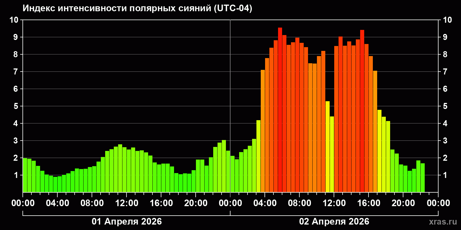 Изменения индекса интенсивности полярных сияний с 2026-04-01 по 2026-04-02 по местному времени