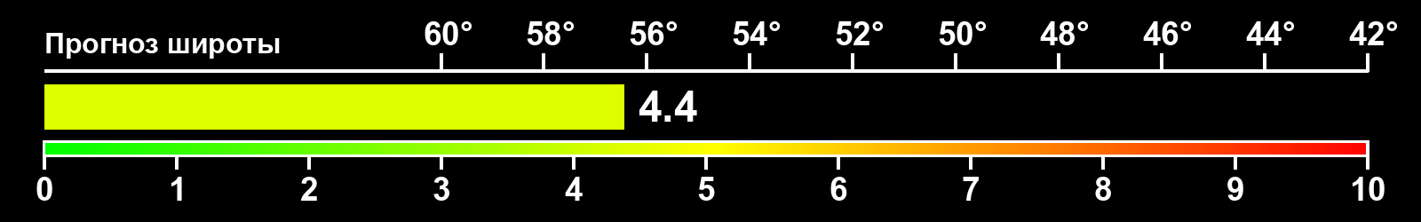 Индекс интенсивности полярных сияний и теоретически возможная широта наблюдений для ночного времени в западном полушарии по состоянию на 2026-04-02 05:49 (конец дня) по местному времени