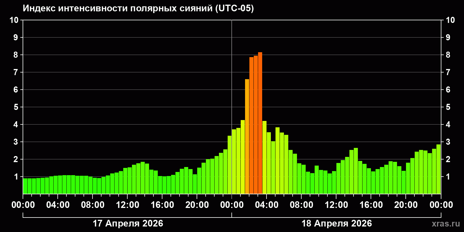 Изменения индекса интенсивности полярных сияний с 2026-04-17 по 2026-04-18 по местному времени