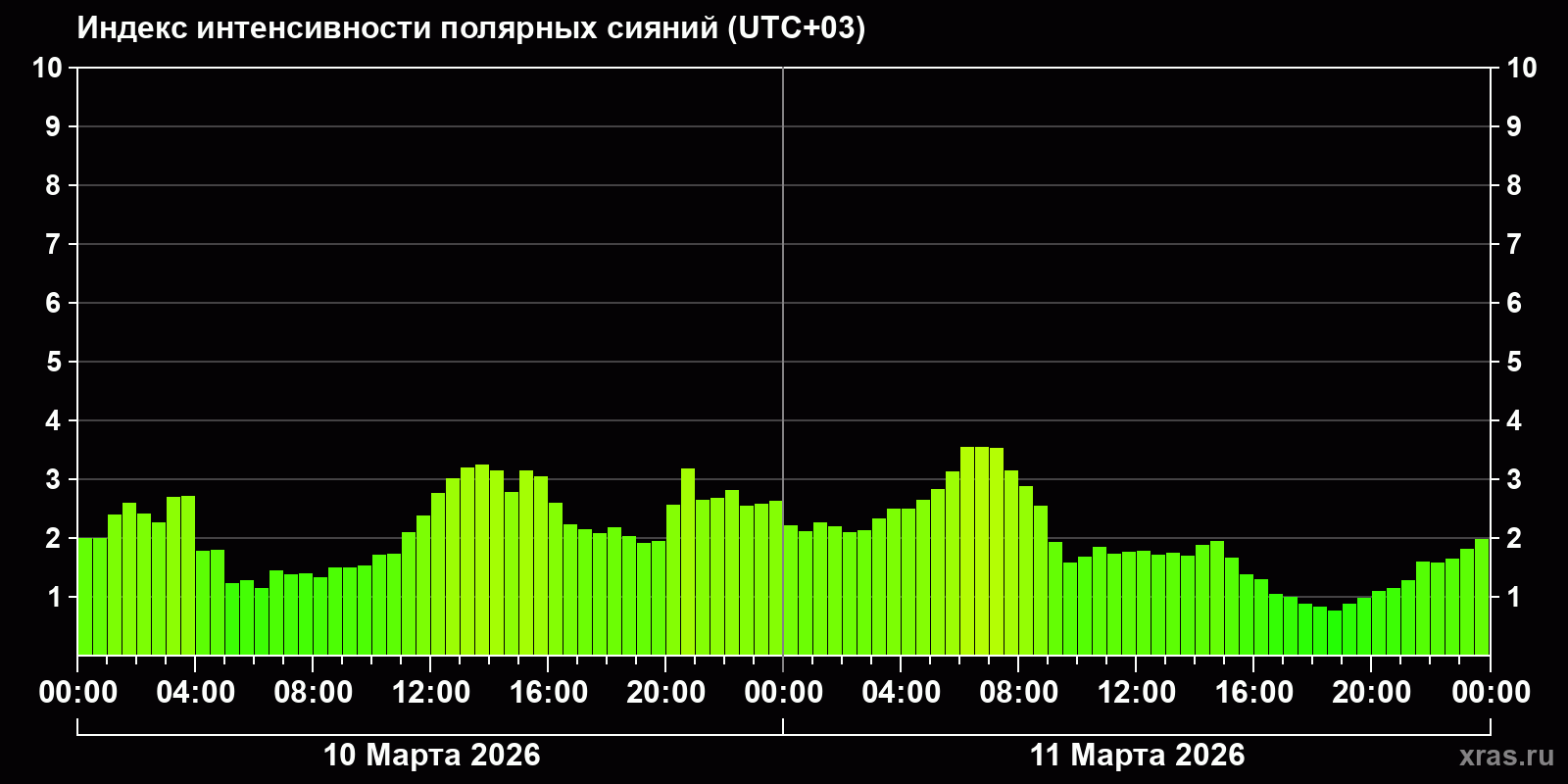 Изменения индекса интенсивности полярных сияний с 2026-03-10 по 2026-03-11 по местному времени